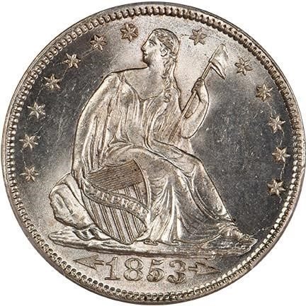 - FROM THE BOYLSTON COLLECTION PART III What a gorgeously lustrous example of this one year only type! WOW! This coin looks like it just came off the dies. In the early 1850s, as huge amounts of gold were flowing east from the California Gold Rush, the value of silver rose against the value of gold, and silver was hoarded. In 1853, Congress passed a law reducing the weight of half dimes, dimes, quarters and half dollars to keep the ratio of gold to silver even, and allow silver to circulate again. To differentiate the new weight standard, arrows were added to the date and rays were added to the reverse of the quarter and half. In 1854, the rays were removed from the reverse, mint officials citing striking difficulty. Arrows remained at the date until through 1855. Possessing a blisteringly brilliant, radiating cartwheel brilliance on the obverse and a rich, satiny frost on the reverse. Both sides show spidery die cracks and die clashes that add to the character and charm of this PQ GEM. Essentially untoned and only a few minor ticks are seen with the aid of a strong glass. The eye appeal is AMAZING for this issue, which often comes dull and lackluster. PCGS 15, NGC 15, CAC 6. This is the ONLY MS65+ graded by either service. The current Collectors Universe value is listed at $25,000. The last PCGS/CAC MS65 sold for $21,150 back seven years ago, and we sold the last PCGS MS66 CAC in December 2017 for $67,563. This stunning GEM is bound to sell somewhere in that range. Good luck! Cert. Number 7425422 PCGS # 6275