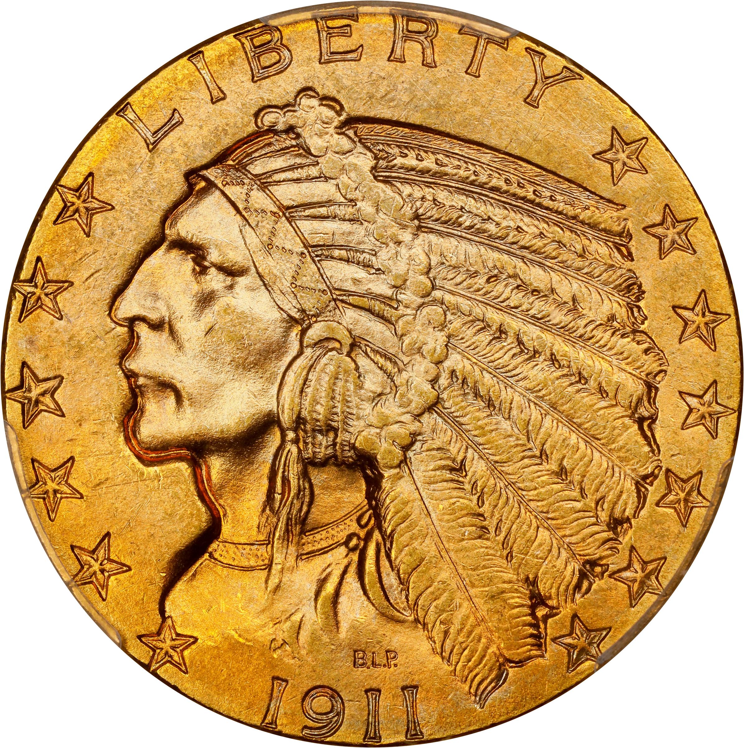 - Stunning, virtually unimprovable near-Gem Mint State quality for this extremely challenging Denver Mint Indian half eagle issue. Lustrous with a softly frosted texture, both sides are further enhanced by lovely color in vivid reddish-gold. Fully struck and crisp defined throughout.<p>At the time the 72,500 half eagles of this date were struck at the Denver Mint, numismatists were still just beginning to appreciate mintmarks. Many collectors, especially those who preferred more traditional avenues for collecting, opted for Proof examples of a particular year. The 1911-D coins were largely ignored when they entered commerce, and unlike many of the other larger denomination gold coins at the time, this issue did not have extended sojourns in overseas banks. Rather, based on the number of circulated examples that survive, a significant portion saw active commercial use, and were further reduced in quantity by the large scale Treasury melts of the late 1930s.<p>Second only to the 1909-O in terms of rarity and popularity, the 1911-D has long since gained appreciation as the key date Indian half eagle that it is. While moderately available at the higher circulated grades, in Mint State the issue becomes a remarkable condition rarity. Most surviving Uncirculated specimens are at the very lowest end of the scale and seldom found Choice. Gem examples are prohibitively rare, leaving premium Select and Choice Mint State pieces in very high demand. Expect spirited bidding when this coin crosses the block; a strong bidding strategy is recommended.