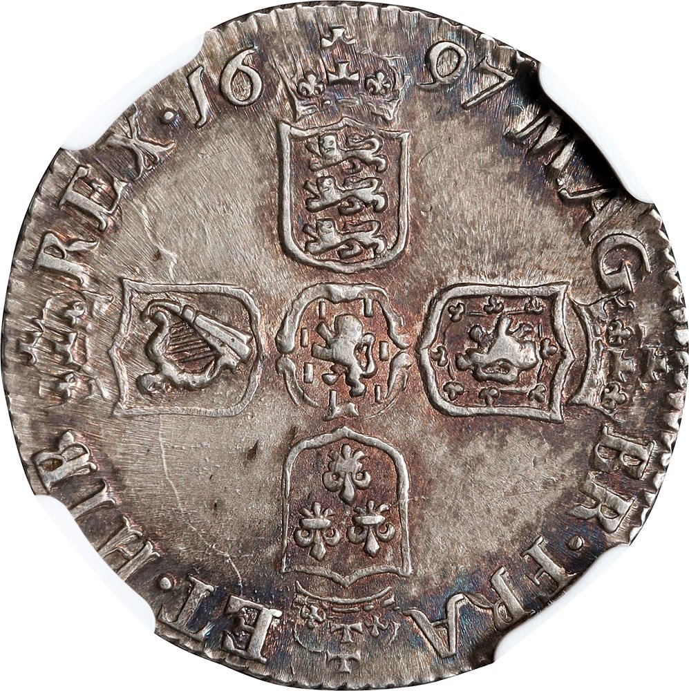- GREAT BRITAIN. 6 Pence, 1697-C. Chester Mint. William III. NGC MS-63.