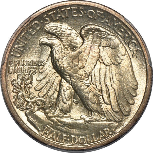 - 13 graded MS-64+, 152 higher at PCGS. Unimpaired luster swirling beneath almond patina leads off the list of accolades for this popular "obverse mintmark" half-dollar, and honestly, the coin has the arm's-length look of a full "gem". Evenly struck, details were well brought up in general, even at Liberty's hand, except that some of the eagle's lower feathers are indistinguishable. Perhaps a few stray carbon spots prevented PCGS from favoring MS-65 territory.