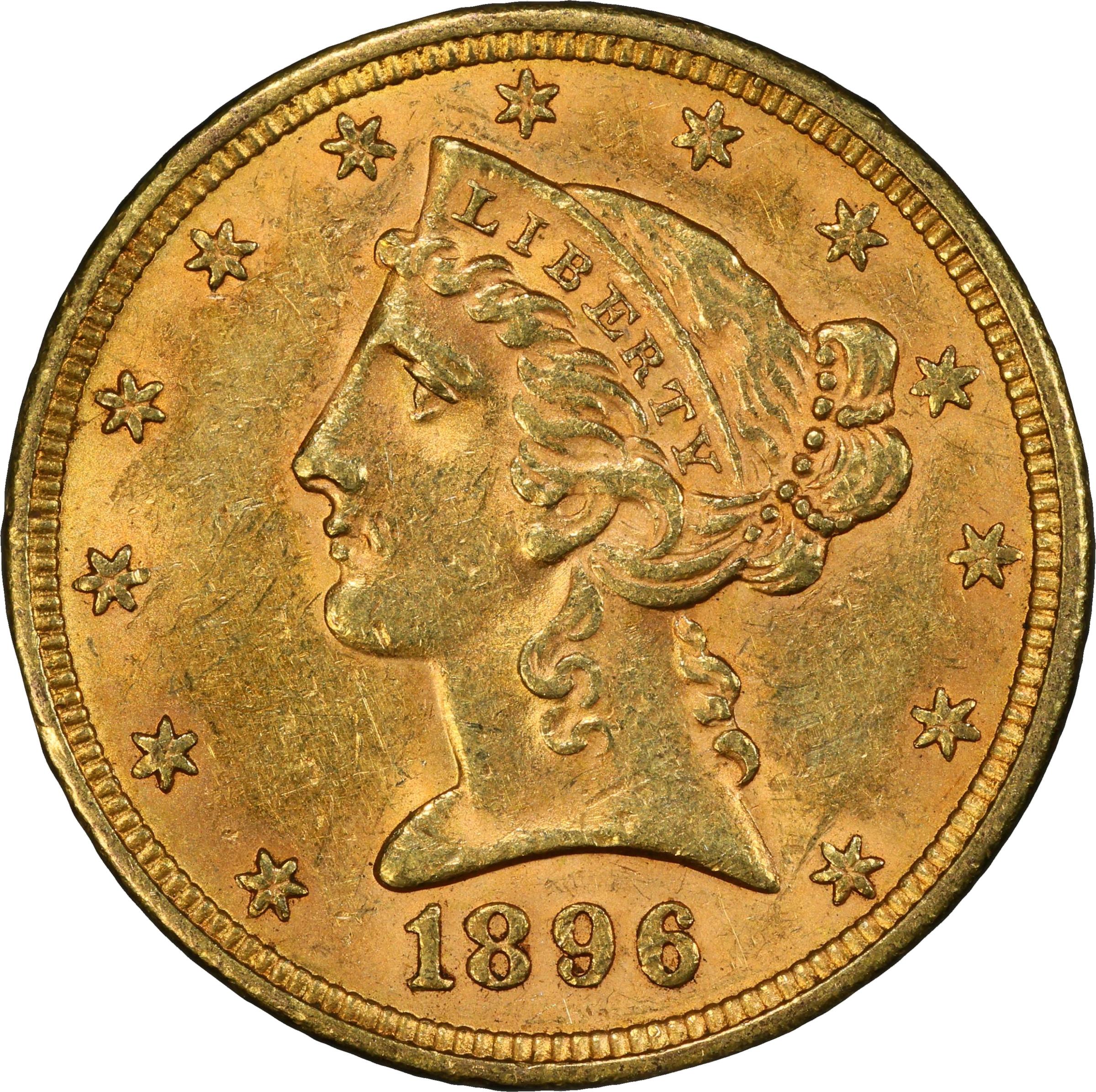 - Exceptional Mint State quality to represent this underrated condition rarity among 1890s half eagles. Sharply struck with bountiful mint luster, both sides exhibit vivid pinkish-apricot color that provides strong eye appeal. Despite a limited mintage of 58,960 circulation strikes, there are enough circulated and lower end Mint State coins extant for the 1896 half eagle to satisfy less discerning collectors. Definitely an underrated issue at the higher Mint State levels, this is one of our finest offerings for the issue in recent decades.