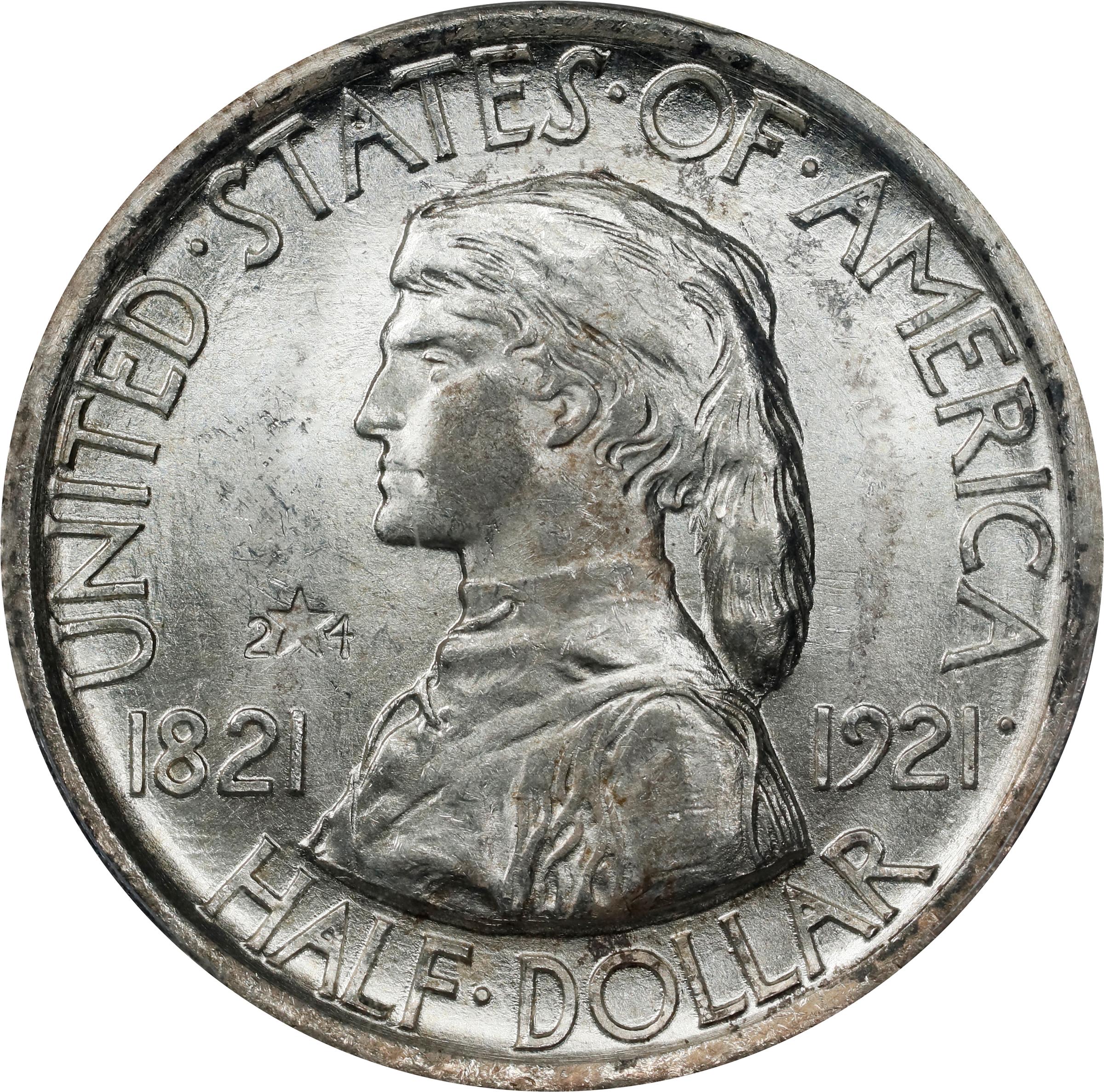 - The Missouri commemorative half dollar was issued to mark the 100th anniversary of the admission of that state into the Union. The authorizing Act of March 4, 1921, allowed for a maximum mintage of 250,000 coins, but only 50,000 pieces were struck: 5,000 with 2x4 in the left obverse field (signifying Missouri as the 24th state), and 45,000 without this feature. Lagging sales resulted in 29,600 examples of the plain variant being returned to the Mint for melting, although all of the 2x4 coins were distributed. With most survivors grading no finer than MS-64, this essentially brilliant and highly lustrous Gem with CAC approval is a superior example of the variety.