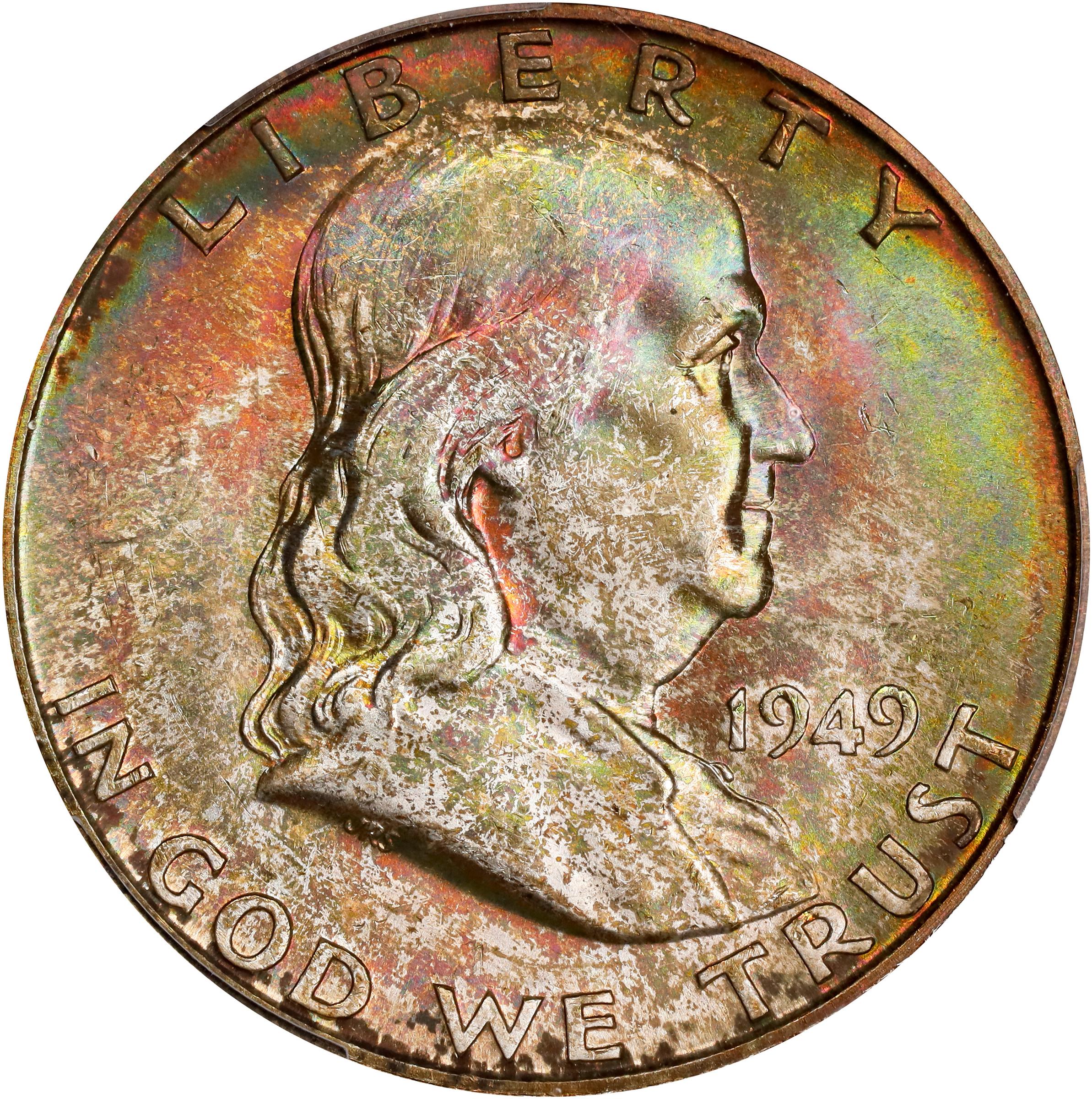 - Almost certainly a former Mint Set coin, this handsome Denver Mint Franklin half dollar exhibits rich, mottled obverse toning in warm reddish-russet and more vivid salmon-pink and sea-green colors. The reverse is more reserved, but still toned, in this case in a dusting of sandy-silver patina. Both sides retain full mint luster in a luxurious frosty texture. Silky smooth in appearance with a razor sharp strike throughout the design.<p>The most conditionally challenging Franklin half dollar produced up to that point in time, the 1949-D is virtually unobtainable in a PCGS MS-67 FBL holder. In fact, as of 2023, when he published the fourth edition of his <em>Guide Book of Franklin & Kennedy Half Dollars</em>, Rick Tomaska observed:<p><em>MS-67 and MS-67 FBL. Perhaps a fantasy coin. None have been graded by either of the major services, and one wonders if they ever will be.</em><p><em></em>Clearly the offered specimen is a newcomer to the market in a PCGS MS-67 FBL holder. As only of only five (!) grading events now reported at this level by PCGS, it a high Condition Census example for the issue - tied for second finest, in fact, behind the PCGS/CAC MS-67 FBL that sold in our November 2024 Showcase Auction. We anticipate both strong bidder competition and a strong price when this remarkable strike and condition rarity goes to its new owner.