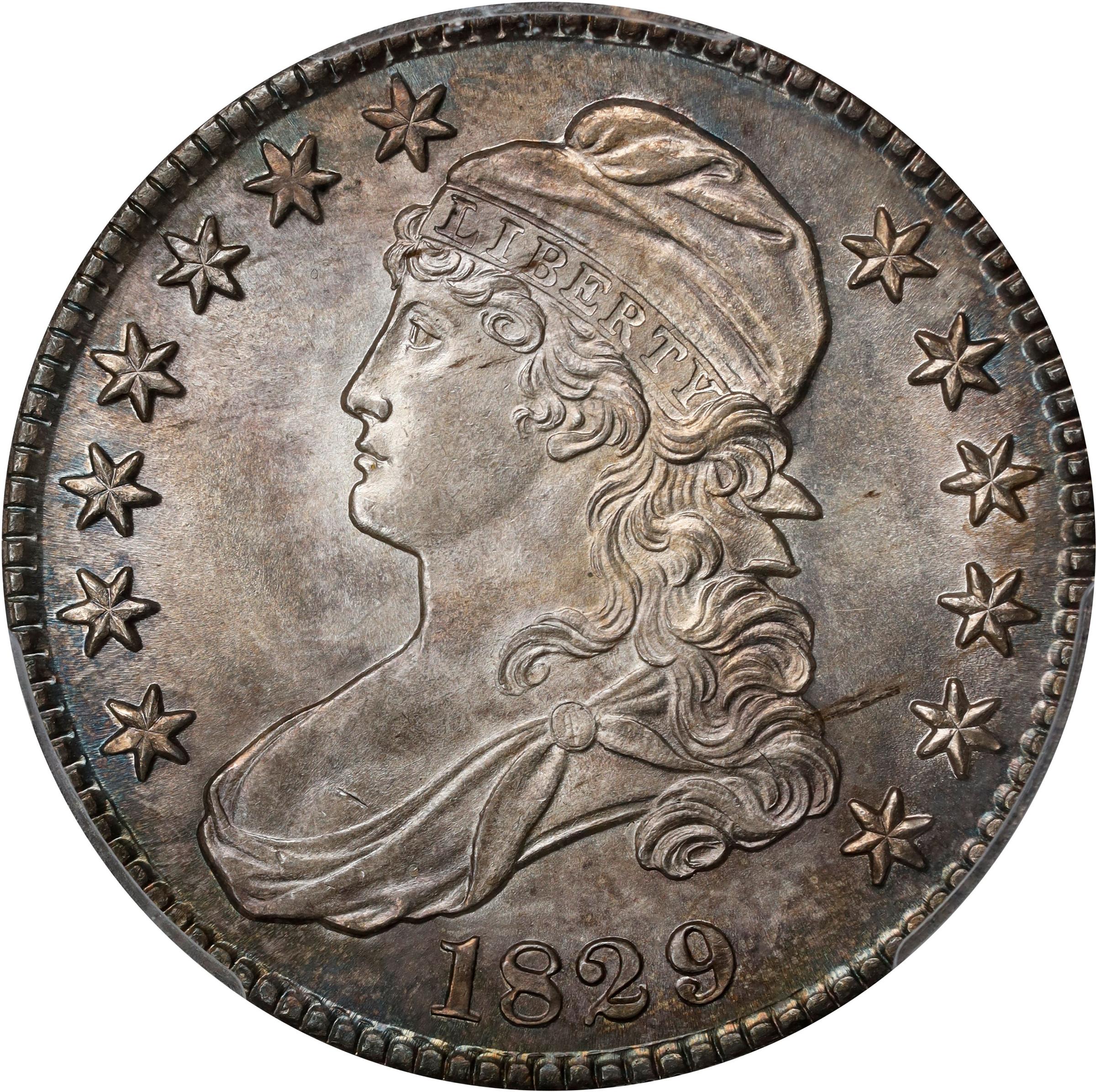 - Strong, frosty mint luster shines forth powerfully from surfaces that are only lightly toned, and then again mostly at the peripheries. The strike is impressively full for a Lettered Edge Capped Bust half dollar, and the in-hand appearance is smooth enough to suggest an even higher grade. In solidly graded MS-64, this lovely example qualifies as Condition Census for the 1829 O-117 dies per the listing in the Spring 2025 revision to Stephen J. Herrman's AMBPR for Bust half dollars. Die State 117.1.