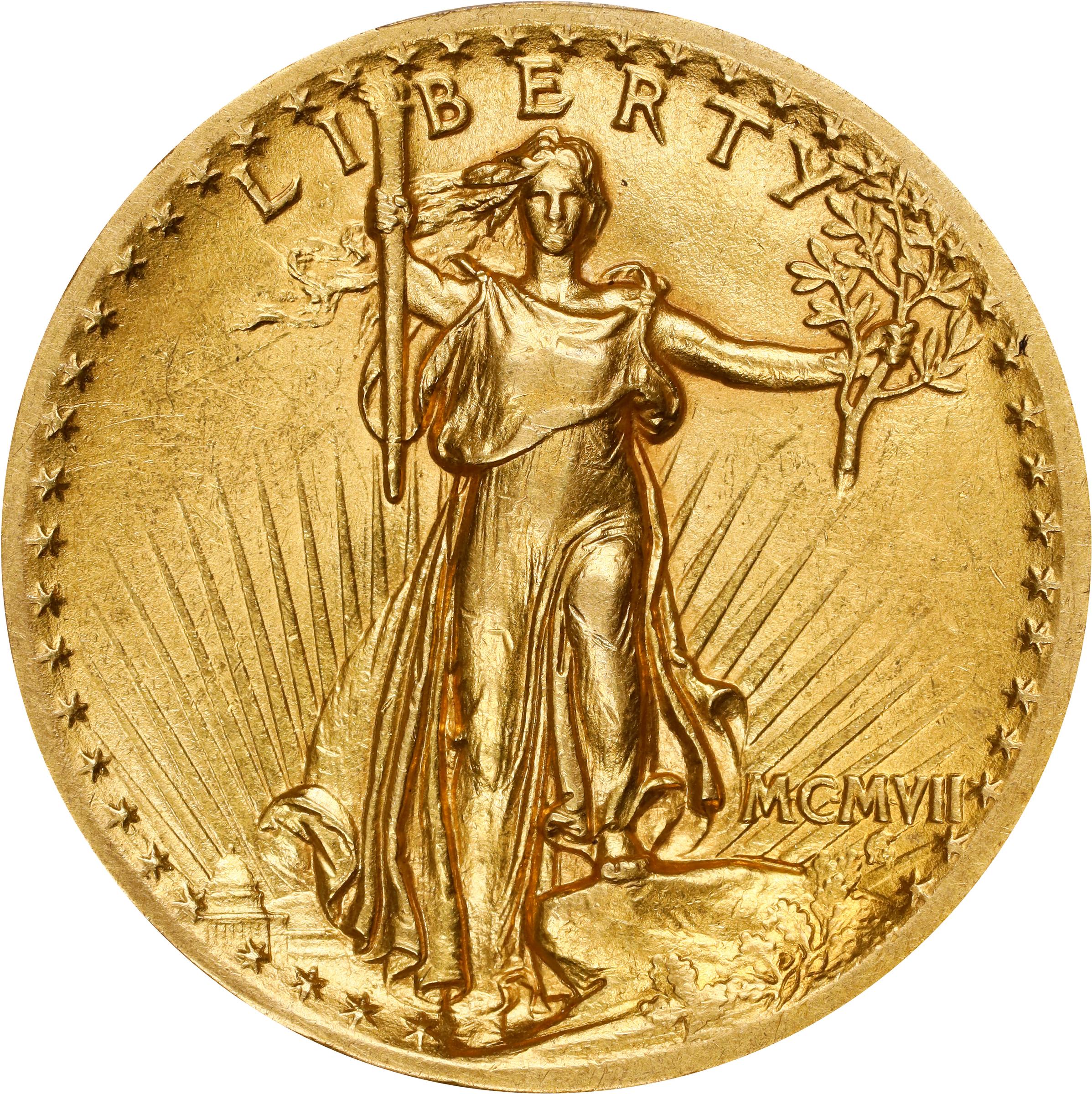 - A wonderfully original example with dominant deep honey-olive color on both sides. Tinges of playful iridescent pinkish-rose toning are also present to further enhance the eye appeal. The design elements remain sharply to fully rendered and allow full appreciation of this iconic design. Lustrous for the grade with strong visual appeal and undeniable technical merits, this is a lovely Choice AU offering for the celebrated High Relief type of Augustus Saint-Gaudens' beautiful double eagle.