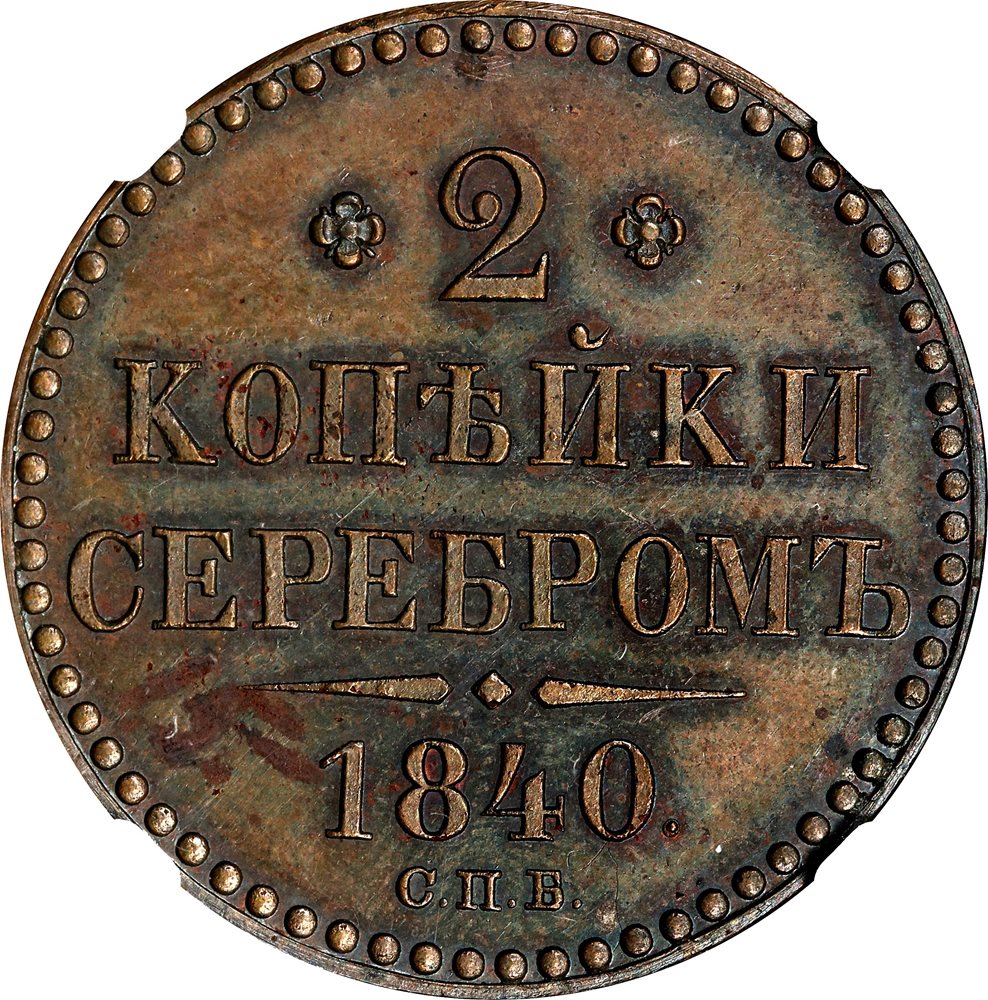 - RUSSIA. Copper 2 Kopeks Pattern Novodel, 1840-CNB. St. Petersburg Mint. Nicholas I. NGC MS-61 Brown.