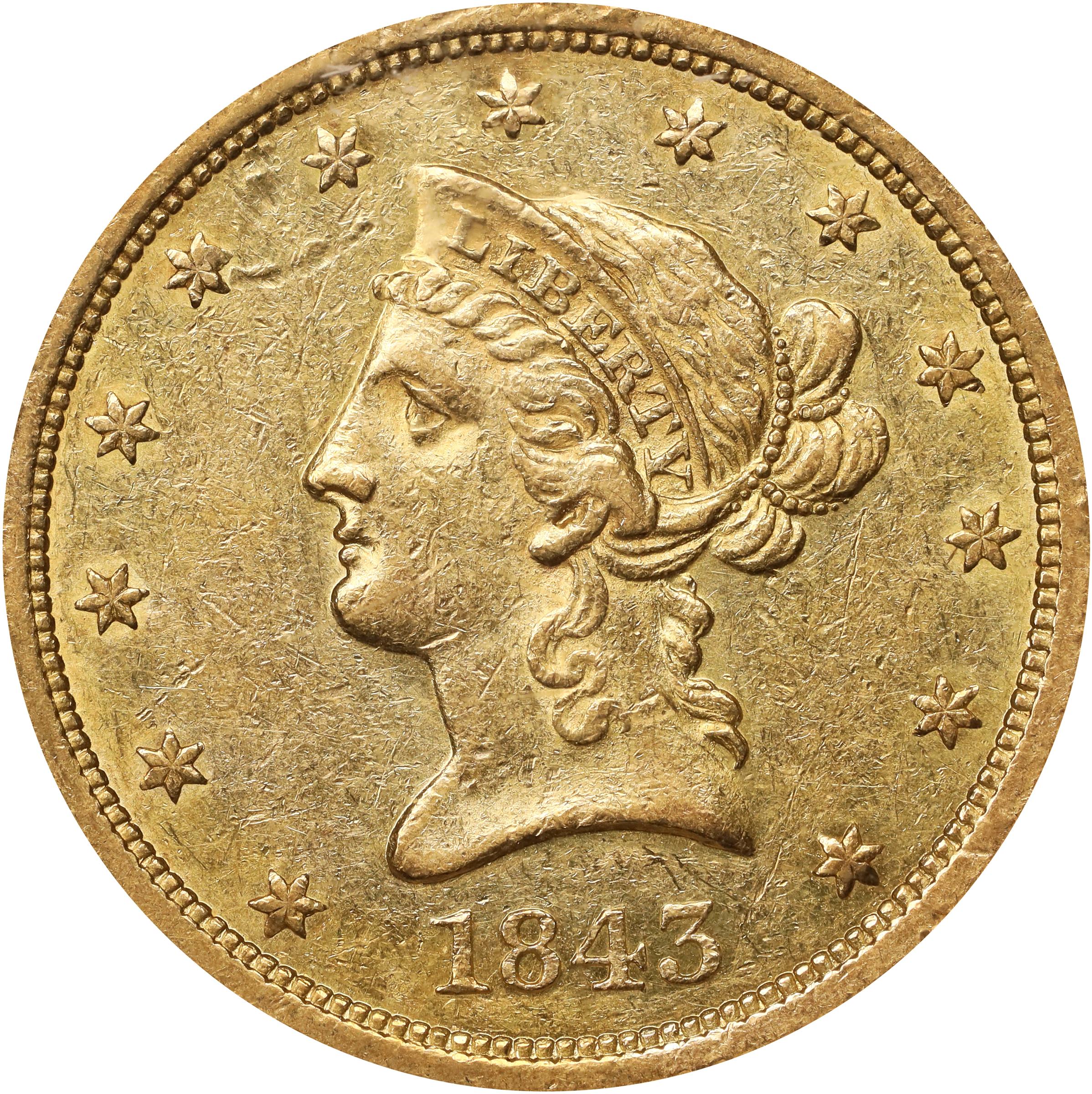 - Blended olive and medium gold colors with traces of mint luster discernible as the surfaces dip into a light. Both sides are sharply to fully defined throughout the design. An overall nice example with excellent eye appeal. Like many of the early eagle issues in the Liberty Head series very few examples of the 1843-O were saved at the time of delivery, survivors much scarcer than a relatively significant mintage of 175,162 pieces might imply.