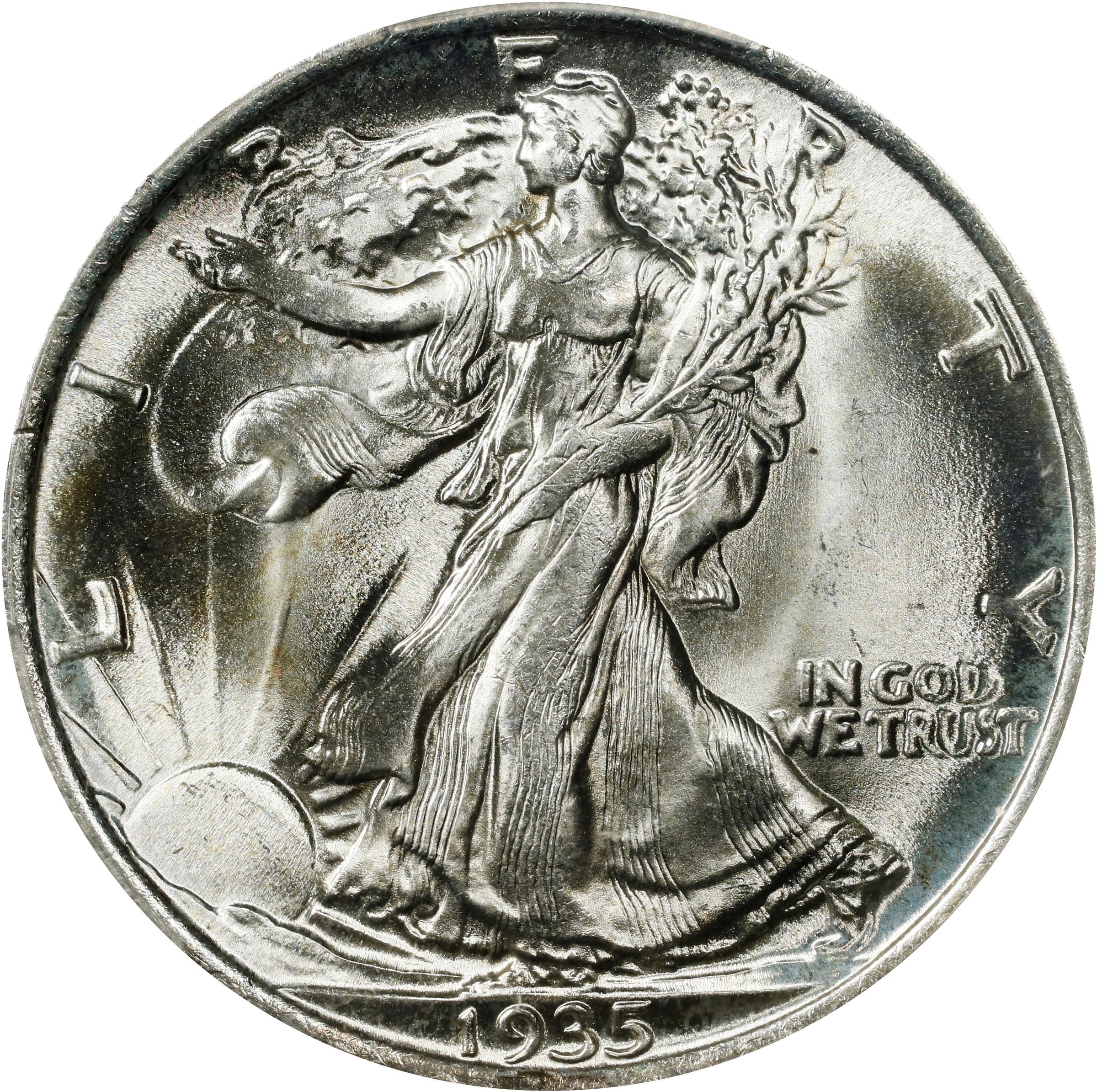 - A gorgeous Superb Gem displaying a boldly struck Liberty, sharp eagle and pristine, lustrous surfaces. This stunning example also features virtually brilliant surfaces that reveal just a hint of champagne-gold iridescence in isolated areas as the coin rotates under a light. It is an impressive condition rarity for this otherwise readily obtainable middle date (1934 to 1940) issue in the Walking Liberty half dollar series.