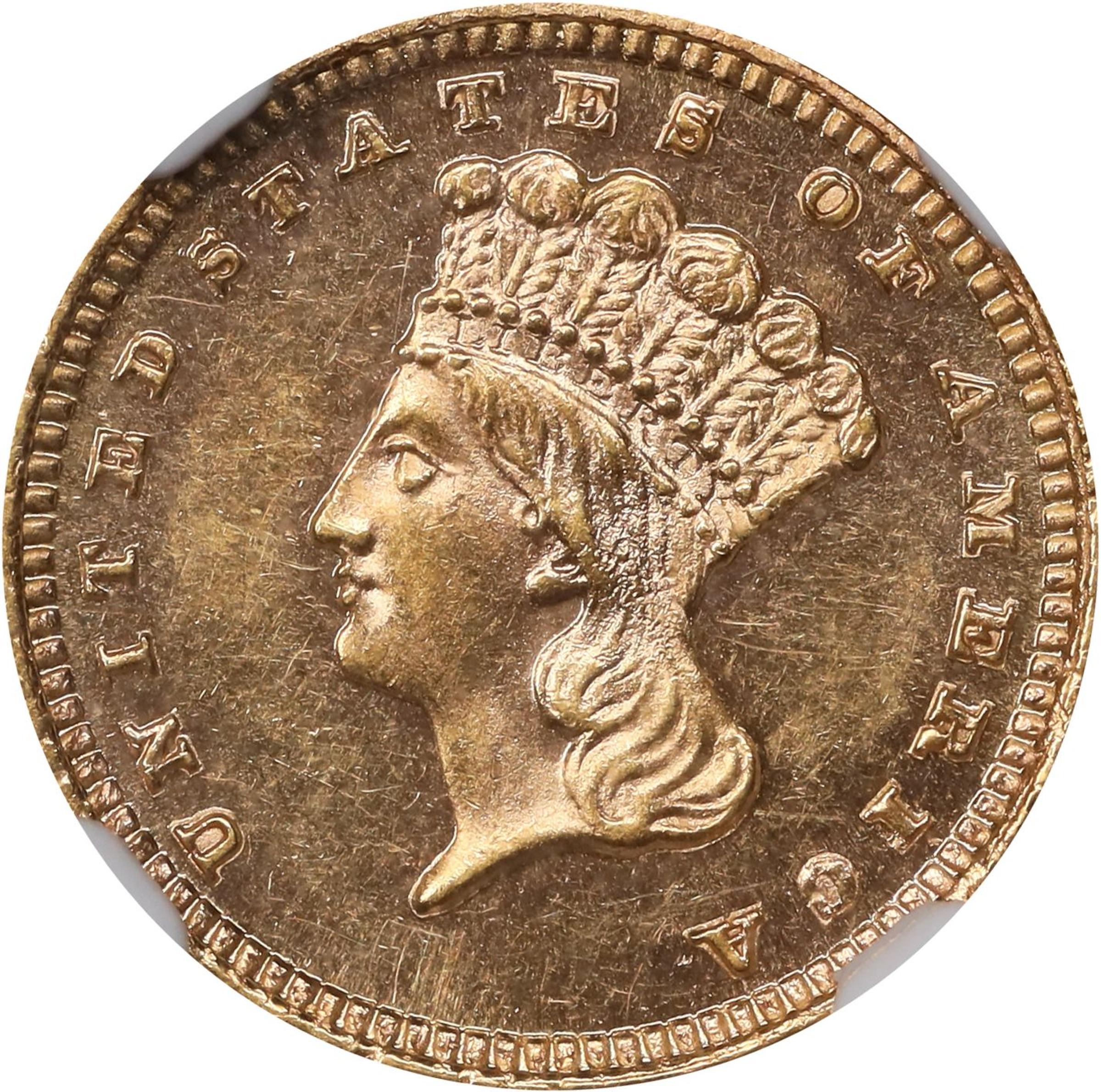 - A rare and significant offering for this late date gold dollar issue in the certified PL category. Nicely mirrored, the fields support frosty and smartly impressed devices. Pretty color in light pinkish-honey provides further appeal.