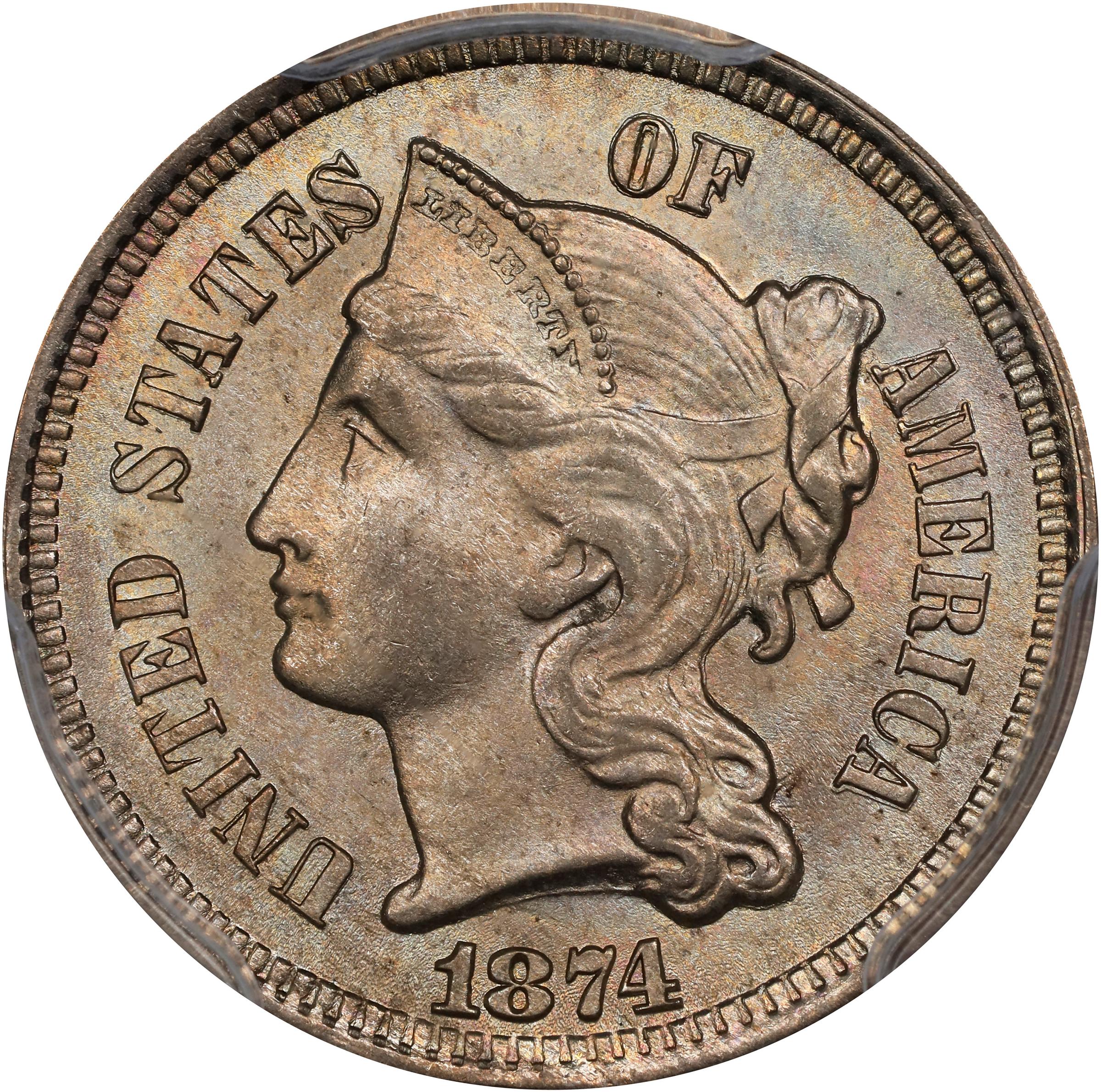- With lovely, iridescent toning in champagne-pink and powder blue on soft satin surfaces. With a respectable (for the type) mintage of 790,000 pieces, the 1874 is one of the more readily obtainable circulation strike nickel three-cent pieces in an absolute sense. On the other hand, few survivors can even approach the quality of the present upper end Gem.