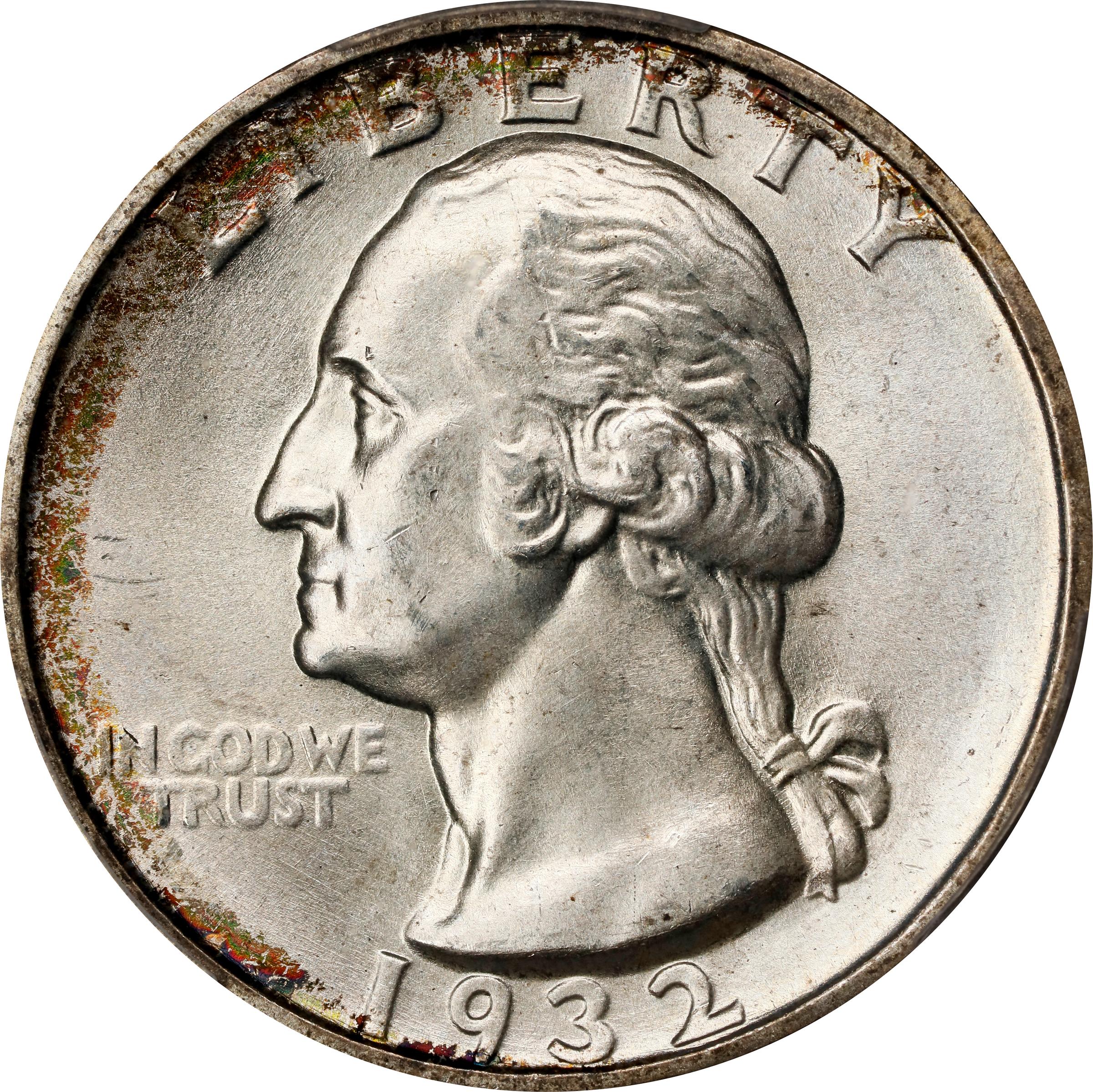 - Extraordinary premium Gem quality for a key date Washington quarter issue that enjoys strong demand throughout the numismatic grading scale. Halos of warm russet and bronze peripheral iridescence are more pronounced on the reverse, the centers on both sides brilliant apart from delicate antique silver tinting. Fully frosted in finish with a razor sharp strike and outstanding surface preservation.<p>The three 1932-dated issues of the new Washington design type are the only quarters produced by the United States Mint from 1931 through 1933. The Great Depression served to limit coinage of many denominations during the early to mid 1930s, and the quarter was no exception. At just 408,000 coins struck, in fact, the 1932-S has the lowest mintage in the circulation strike Washington series, and it is the rarest issue of its type in Gem Mint State after only the 1932-D. Tied for finest certified at PCGS, this low pop MS-66 represents an important bidding opportunity for the advanced Washington quarter enthusiast.