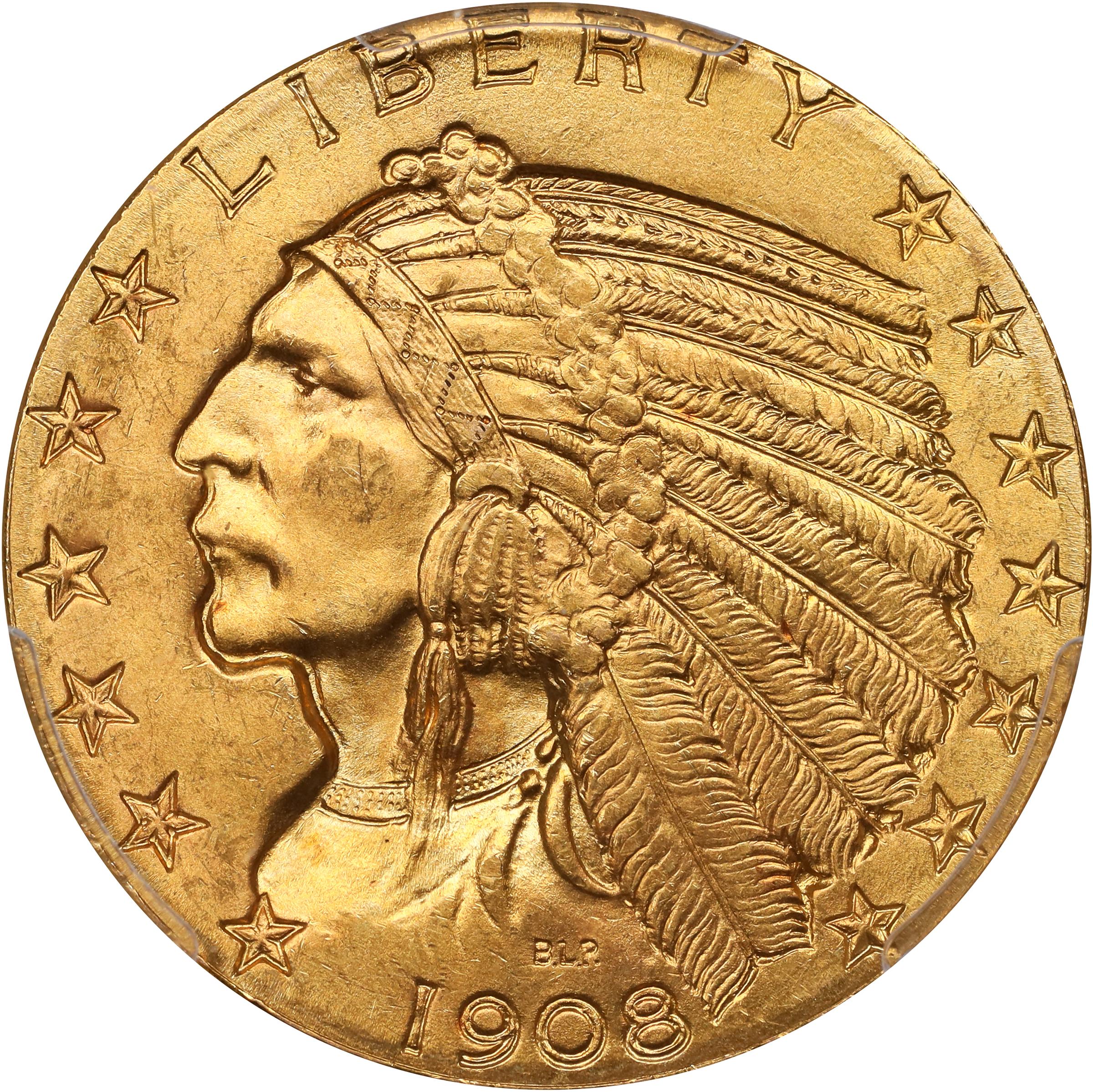 - This is the first year of issue of the Indian half eagle series and a date that is extremely popular with collectors, particularly at the Gem level. The color is splendid with classic orange-gold throughout, while the luster is satiny and intense. Fully struck as much as these come, the 1908 half eagles are always a trifle soft on the upper points of the design, the eagle's wing tip in particular near his neck. Note that partial feather definition is present, more than commonly seen in fact for this date. Surface quality is outstanding and merits particular attention as Gems are legitimately scarce and anything finer is rare. A highly desirable example of this initial Indian half eagle issue and a coin that will hallmark any advanced collection.