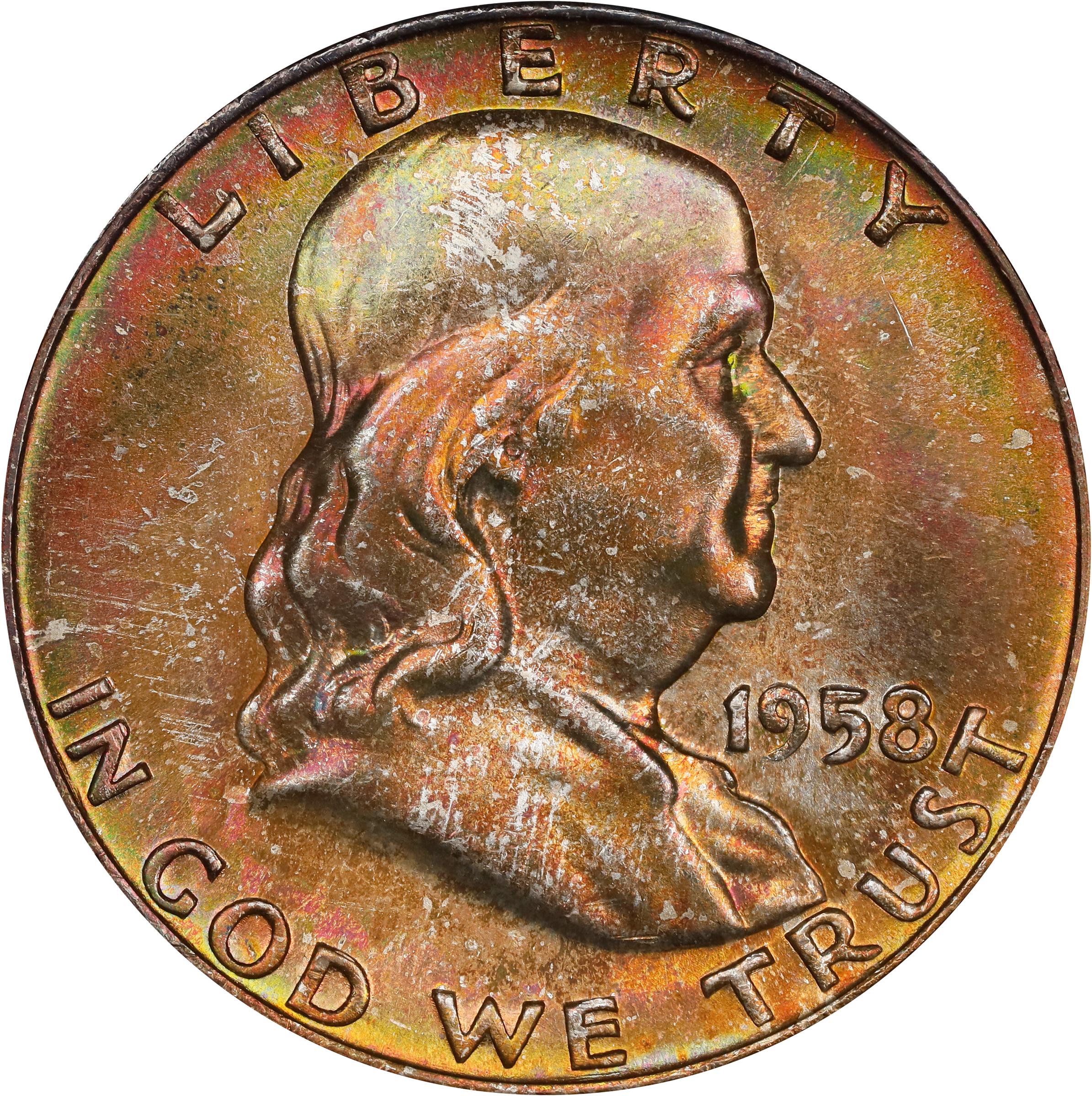 - This richly toned example is overlaid in bold patina of sunset-orange, salmon pink, rose-red, and blue-gray colors. Both sides are softly lustrous with smartly impressed, expertly preserved surfaces that are very nearly pristine. The toning confirms Mint set origin for this exquisite 1958-D half dollar, as are virtually all Superb Gems certified by PCGS and NGC.
