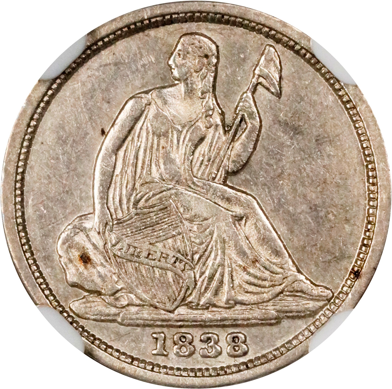 - This is a charming piece with silver-gray surfaces. Both sides are sharply defined with an overall smooth, soft satin texture. A historically and numismatically significant issue, the 1838-O is the premier New Orleans Mint half dime and the only mintmarked issue of the Liberty Seated, No Stars half dime type. Far rarer than the 1837 No Stars in all grades, both due to a more limited mintage of 70,000 pieces and a higher rate of attrition suffered through circulation, AU examples are ranked Rarity-6 by Al Blythe in the 1992 reference <em>The Complete Guide to Liberty Seated Half Dimes.</em>