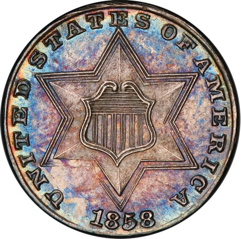 A borderline GEM caliber example of this popular early date Proof 3 cent silver. Only about 100 Proofs were struck of this first year that Proofs were made for general public sale to collectors and this one is wonderfully preserved and totally original. A watery reflective mirrored finish to the fields beam boldly gives this lovely coin a great look, accenting the dappled multi-hued pastel tones. The eye appeal is fabulous. Only 100 Proofs were struck. PCGS 40, NGC 39, CAC 8. The most recent example to sell was the Dale Friend Collection coin that we sold in April 2022 for $4,348. The current PCGS Price Guide value is listed at $5,250 and the CAC CPG value is listed at $5,100. Quite scarce finer. Good luck. Cert. Number 42131041 PCGS # 3705