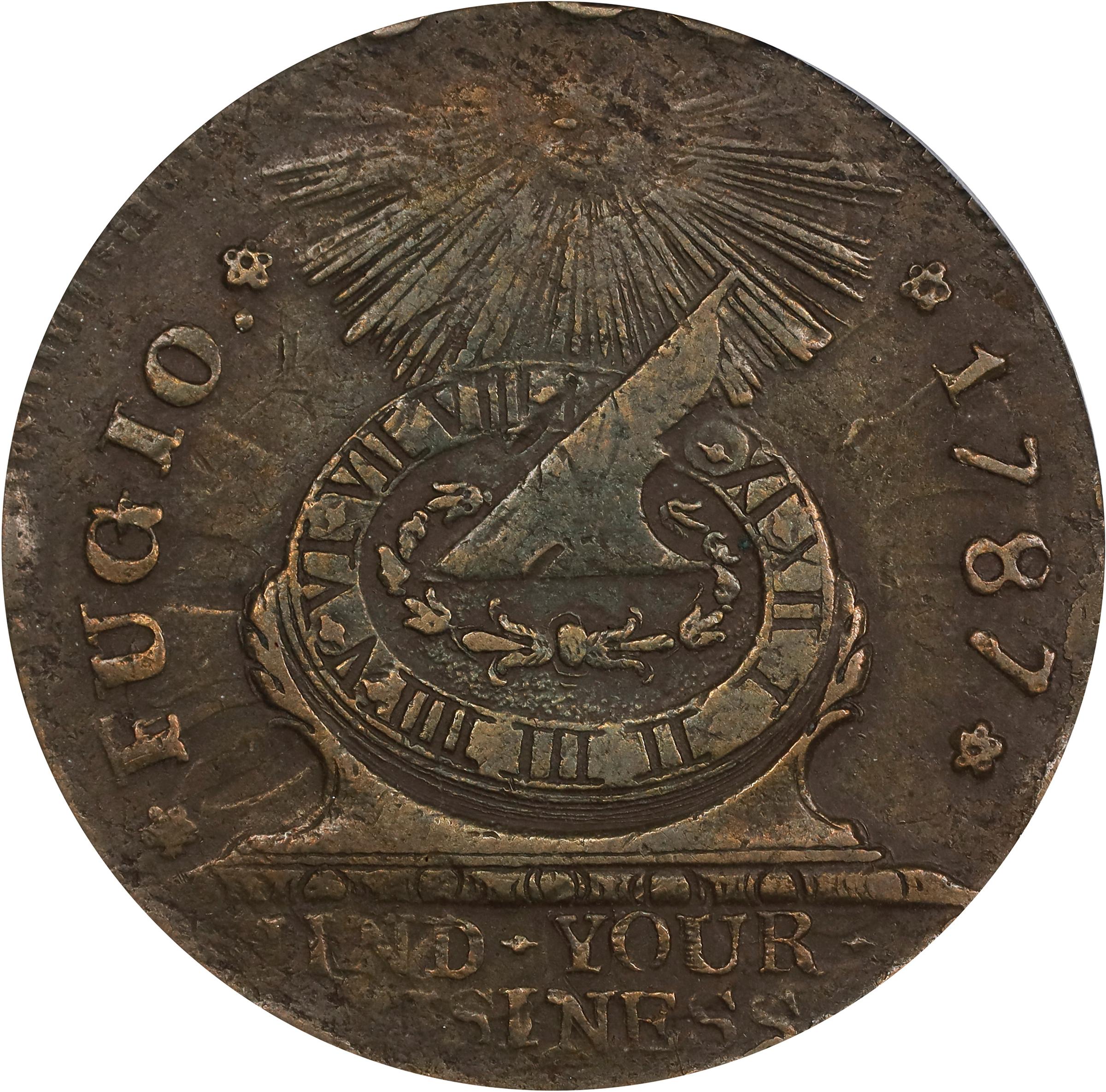 - The Newman 13-X is perhaps the classic Fugio type coin, easily obtained in high grades as the largest proportion of the Bank of New York hoard. Offered is a richly original AU example with steely-olive and russet patina, faint gold and reddish-rose highlights flashing into view as the surfaces rotate under a light. The impression is a bit tight to 5 o'clock on the obverse, 1 o'clock on the reverse, but only portions of the border denticulation are appreciably off the flan. We do note isolated peripheral softness, most notably at upper and lower left obverse, where portions of the sun and some of the letters in MIND and BUSINESS are indistinct, but in general this is a boldly to sharply defined coin at the assigned grade level. It is also a pleasingly smooth one, the surfaces a tad rough, but with only a few faint marks, mostly on the reverse, although even then none are worthy of individual attention.<p>The Bank of New York Hoard was discovered numismatically in the 1850s. When inventoried in 1948, it was found to contain 1,641 Fugio cents, 726 of which were of the Newman 13-X attribution. The coins from this hoard, especially the Neman 13-Xs, have been a blessing to modern type collectors as they provide ample opportunity to acquire an attractive Fugio cent at price points that are accessible to many buyers. At the certified AU level, this one is particularly nice and will prove popular with bidders.