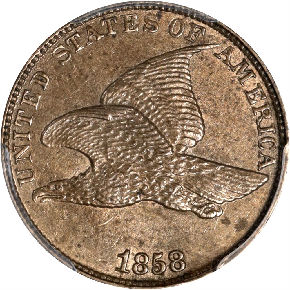 - 1858 Flying Eagle Cent. Large Letters, High Leaves (Style of 1857), Type I. AU-58 (PCGS). CAC.