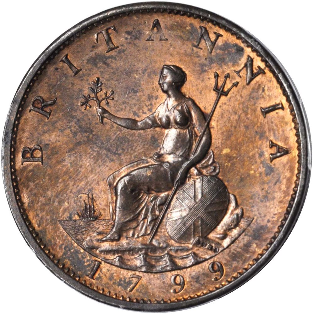 - GREAT BRITAIN. 1/2 Penny, 1799. George III. PCGS MS-63 Red Brown Gold Shield.