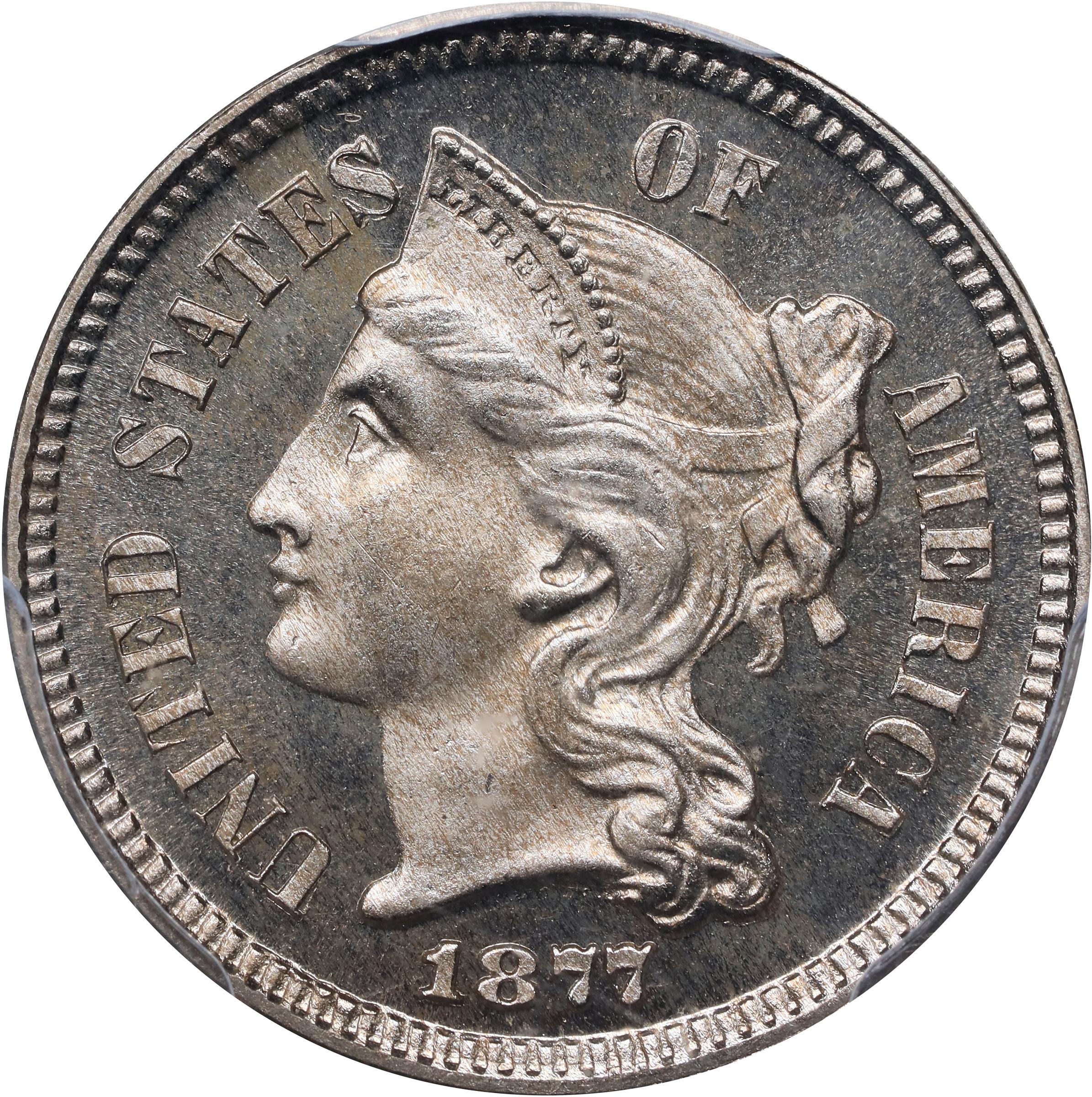 - The first of three Proof-only issues in the nickel three-cent series, the 1877 reflects greatly reduced demand for this denomination in circulation as the nation recovered from the Civil War and moved past the Reconstruction era. Collector demand remained strong, however, as evidenced by John W. Dannreuther's (2023) estimate of 1,100 Proofs struck as opposed to the traditional figure of 510+ pieces published in the <em>Guide Book</em>. Since the 1877 Shield nickel is also a Proof-only affair, contemporary numismatists had to order the three-piece minor Proof sets to get these coins, requiring a generous mintage to fill orders. Yet with only 900 or so specimens believed extant, and no corresponding circulation strikes, the 1877 as a date is the rarest in the nickel three-cent series. Offered is a lovely Gem Cameo Proof with delicate iridescent gold toning on nicely contrasted surfaces. An ideal candidate for inclusion in a high grade nickel three-cent set.