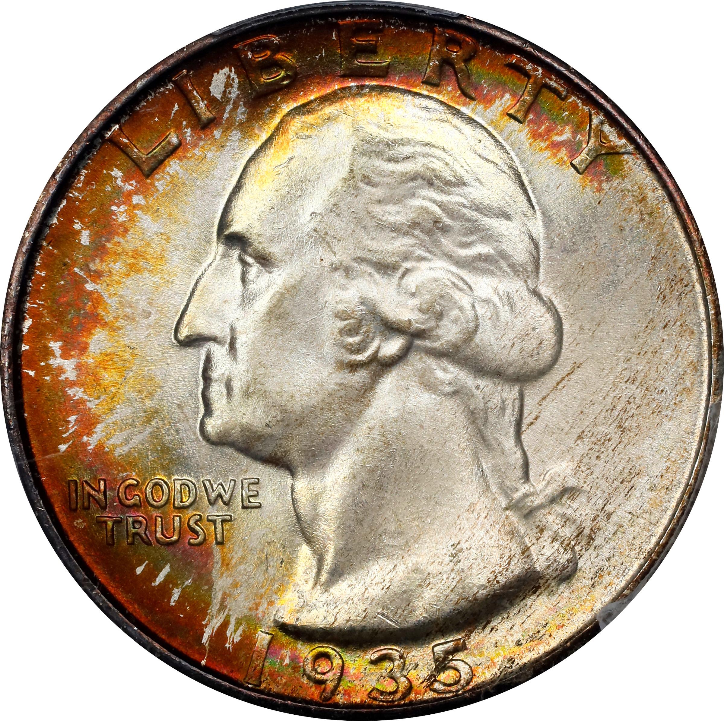 - An enchanting example that will delight both advanced Washington quarter collectors and toning enthusiasts. The toning is certainly superior for a Washington quarter, especially an early date example, with gently mottled reddish-russet, antique gold and powder blue iridescence around the peripheries. Otherwise dusted with pale silvery tinting, both sides are further enhanced with billowy mint luster in a softly frosted texture. The surfaces are virtually pristine, and the strike is sharply executed with crisp definition to even the most intricate design elements. If building a truly spectacular Washington quarter set is your current numismatic focus, the opportunity represented by this top-pop 1935-S deserves serious consideration and should be met with an aggressive bidding strategy.