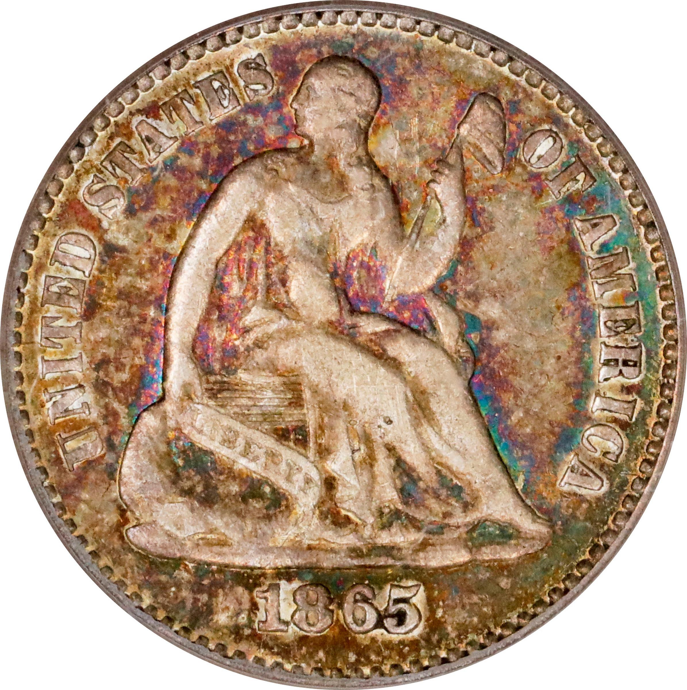 - With silver coins still absent from commercial use in the East and Midwest during the final year of the Civil War, it is little wonder that the Philadelphia Mint produced just 13,000 circulation strike half dimes in 1865. This issue is understandably scarce in an absolute sense, and with coveted CAC approval it is an undeniable rarity in all grades. Richly original toning and an impressive numismatic provenance further the appeal of this noteworthy piece. The reverse is rotated approximately 30 degrees clockwise from normal coin alignment.