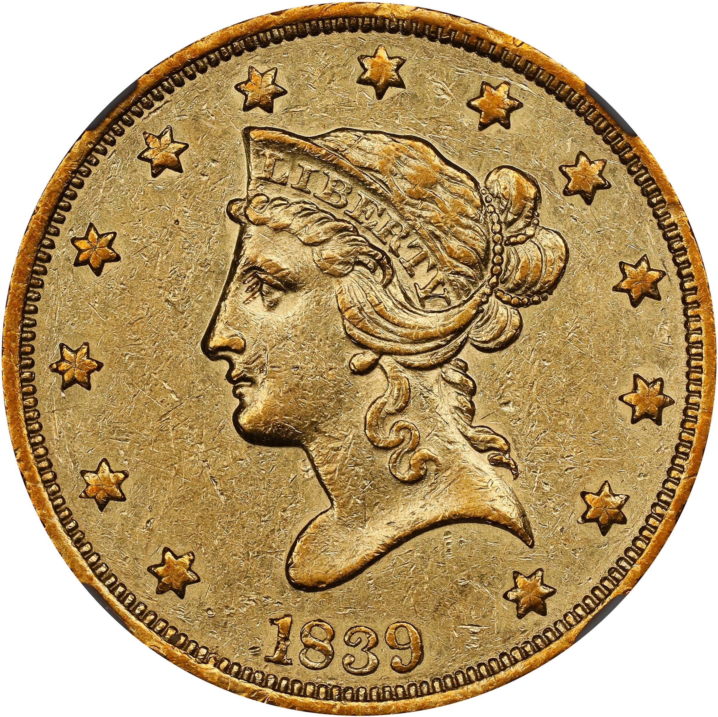 - This desirable example exhibits subtle olive undertones to dominant bright honey-gold color. Traces of prooflike reflectivity are seen in the fields, while the design elements exhibit a more frosty texture. Sharply defined throughout the focal points, only at the obverse stars do we note significant - and expected - softness of strike. The surfaces are lightly to moderately marked, but reveal few singularly distracting marks during in hand viewing.<p>The longest-running $10 gold eagle series produced in the United States Mint, the Liberty Head eagle was struck without interruption from 1838 through early 1907. It is the first eagle produced since 1804, as President Thomas Jefferson halted production of this denomination and the silver dollar that year as rising bullion prices made the coins highly susceptible to exportation and melting. From 1805 through 1837, the largest gold denomination that the United States Mint produced was the $5 half eagle. By 1838, however, two laws had been passed that made it possible for the Mint to resume eagle coinage. The first was the Act of June 28, 1834, which reduced the weight of standard U.S. gold coins and, in so doing, placed the nation's monetary system on a gold standard. The second was the Act of January 18, 1837, a general overhaul of the nation's coinage laws that, among other things, standardized the fineness of gold and silver coins at 900 thousandths.<p>When eagle production finally resumed in 1838, the Mint settled upon the Liberty Head design of Christian Gobrecht, featuring a portrait of Liberty facing left, her hair tied in a bun at the back of her head and wearing a coronet inscribed LIBERTY. Thirteen stars encircle the border, and the date is below the portrait. The initial portrait utilized in 1838 and early 1839 had deeper curvature to the truncation of the bust with Liberty's hair pulled back over her ear. The design was modified slightly in 1839 to create the Liberty Head motif that would remain in use through 1907.<p>The basic reverse design also remained unchanged from 1838 to 1907, featuring an eagle with outstretched wings and a shield on its breast. The eagle clutches a group of three arrows in its left talon and an olive branch in its right talon. The legend UNITED STATES OF AMERICA is around the border and the denomination TEN D. is below the eagle. The reverse was modified in 1866, however, with the addition of the motto IN GOD WE TRUST on a scroll above the eagle. To distinguish them from their No Motto predecessors, the Motto eagles of 1866 to 1907 are known as the Type II Liberty Head design.<p>As above, the first iteration of Christian Gobrecht's new Liberty Head eagle bore a distinctive obverse featuring a sweep of hair completely covering Liberty's ear and a peculiarly deep curve to the bust's truncation. Benjamin West's painting <em>Omnia Vincit Amor</em> ("Love Conquers All") served as Gobrecht's model, even down to the beaded cord and coronet style. The first eagles using this design were struck at the end of 1838, with 7,200 pieces intended for circulation on top of four "specimen" coins presented to Secretary of the Treasury Levi Woodbury. In 1839, the same obverse design was employed for the first 2,801 eagles struck bearing that date before the design was modified.<p>With such a limited mintage, it is little wonder that the 1839 Type of 1838 eagle is a very scarce coin in all grades. Just under 250 examples are known, the vast majority of which are well circulated. While just a hair more available than the first year of issue, there is quite a bit of competition between type collectors and classic period gold specialists when an example appears for sale, regardless of condition. As a pleasing AU-58 certified by NGC, this is a numismatically desirable specimen that will attract significant attention from advanced numismatists.
