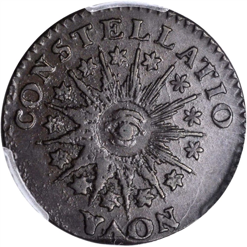 - 1785 Nova Constellatio Copper. Crosby 3-B, W-1895. Rarity-2. CONSTELLATIO, Pointed Rays. AU-53 (PCGS).