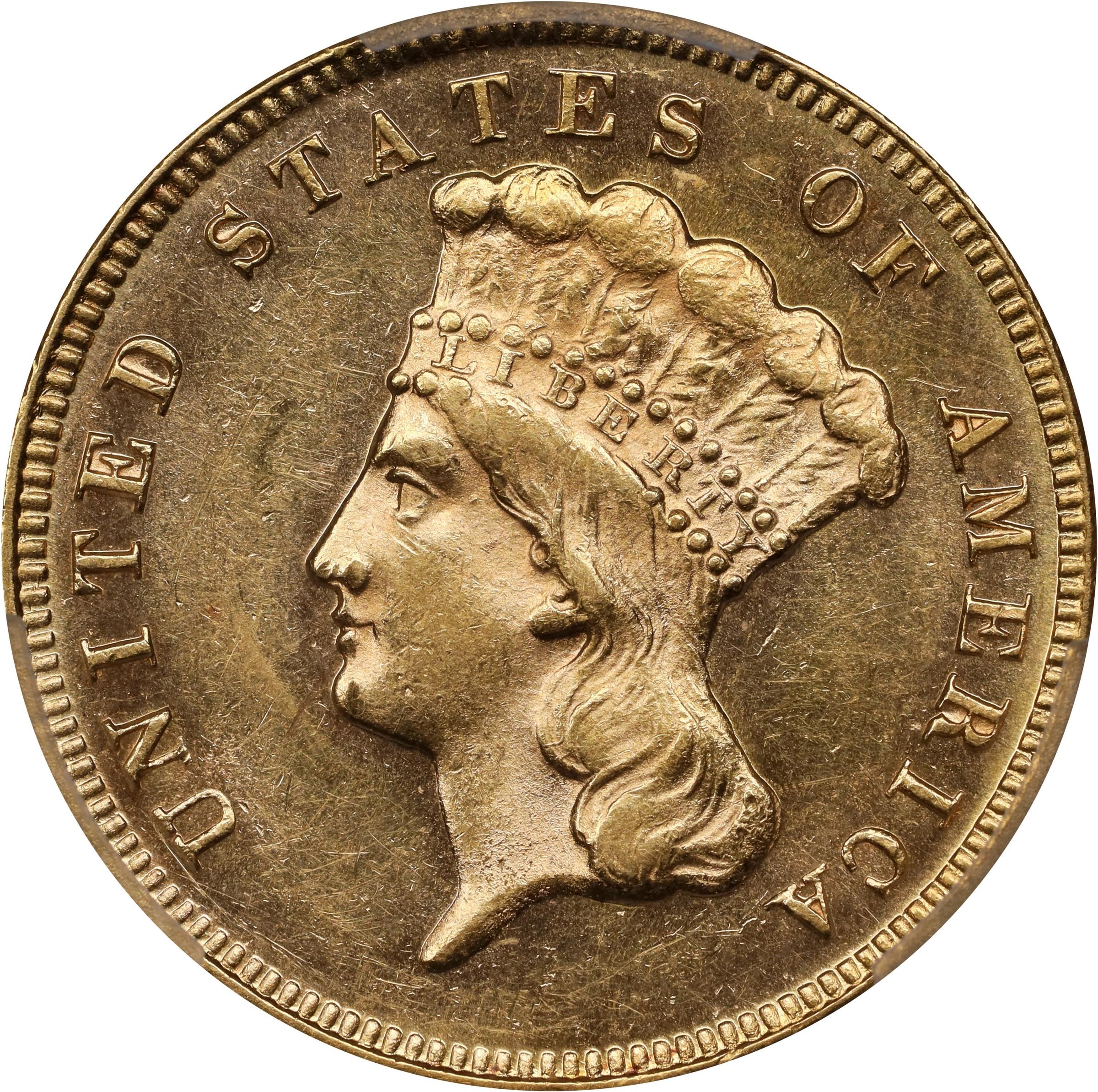 - Boldly struck and vivid BU quality for this desirable type issue in the challenging three-dollar gold series of 1854 to 1889. The finish is noticeably semi-prooflike with reflective tendencies in the fields contrasting softly frosted motifs. Pretty bright honey-gold color with a tinge of pale pink.