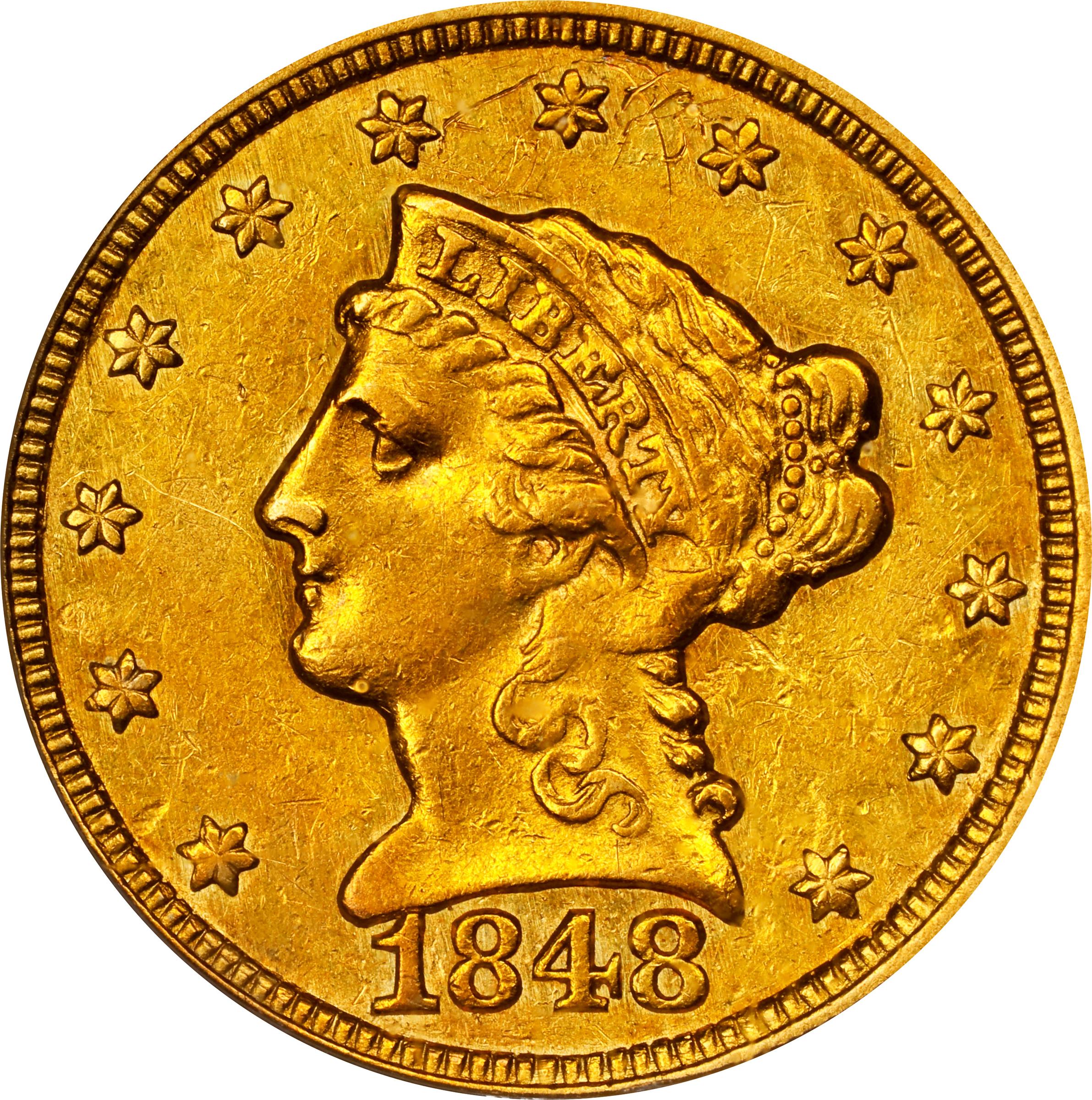 - An attractive, minimally circulated survivor of this classic issue with direct links to the California Gold Rush. Vivid rose-orange color blankets both sides, the surfaces of which retain much of the original satin to semi-reflective finish. Lightly struck on the high points of the eagle, typical of the issue, yet with much of the wing plumage bold and the obverse boldly detailed throughout. Wispy handling marks are generally commensurate with the assigned grade, although accuracy compels us to mention a concentration of light pin scratches at the upper obverse border, in the field around star 7.<p>In 1848 some 230 or so ounces of gold bullion from the recently discovered California gold fields was sent to Secretary of War William L. Marcy by Colonel R.B. Mason, acting military governor of California. Marcy turned the bullion over to the Mint, where it was used to strike 1,389 quarter eagles. In order to denote the origin of the gold used for this special limited mintage, the letters CAL. were punched into the upper reverse field above the eagle's head on all the specimens struck. This distinguishing feature marks the 1848 CAL. quarter eagle as our nation's first commemorative issue, produced 44 years prior to the 1892 Columbian Exposition half dollar.<p>Given the popularity of the California Gold Rush era with numismatists and other collectors, the 1848 CAL. has long enjoyed strong demand. Indeed, the acquisition of an 1848 CAL. quarter eagle is a defining moment in the formation of any collection. Survivors are scarce, and appearances on the open market are rare, so much so that even the offering of a lower grade example represents an important opportunity. As an aesthetically pleasing AU, the present coin is sure to see spirited bidding at auction. Ranked #70 in the fifth edition (2019) of the influential reference <em>100 Greatest U.S. Coins</em> by Jeff Garrett and Ron Guth.<p><em>PCGS Coin Facts</em> notes:<p><em>The stamping appears to have been done while the coins were still in the press, as none of the obverse features appear to have been flattened...Only a single "CAL." punch was used...Placement of the punch relative to other elements on the reverse varies.</em><p>On the present example, the CAL. is set higher in the field than usually seen, and much closer to the letters TES in STATES than the eagle's head.