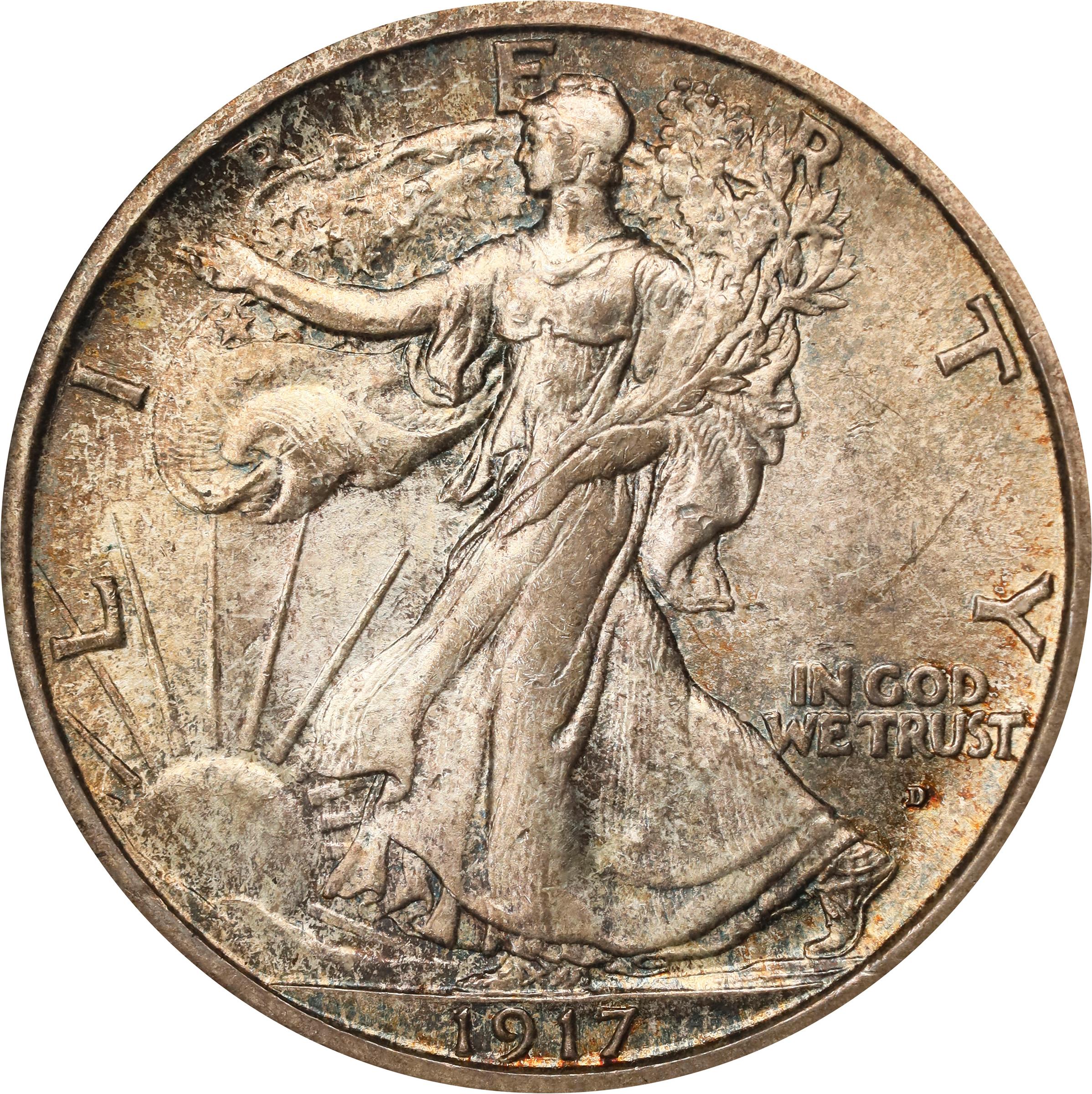 - This fully original, softly frosted example exhibits speckled golden-russet peripheral toning. Boldly to sharply struck in most areas with superior surface preservation for this issue. The 1917-D Obverse Mintmark has the lowest mintage figure of any of the mintmarked varieties of the date. It is scarce in lower Mint State grades and rare in Gem and above. The present piece represents a significant find for the advanced Walking Liberty half dollar enthusiast.