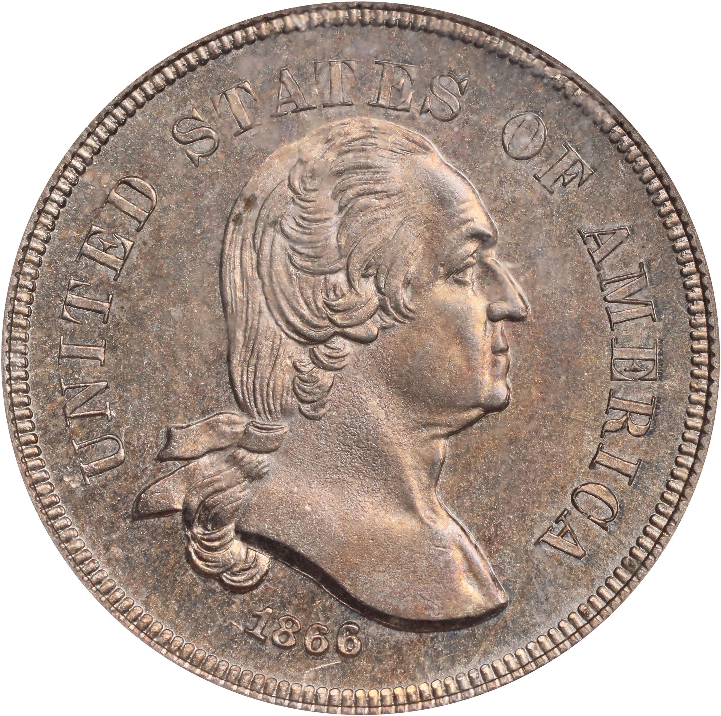 - <strong>Obv:</strong> A bust of Washington faces right with the legend UNITED STATES OF AMERICA above and the date 1866 below. <strong>Rev:</strong> The denomination 5 CENTS is surrounded by a laurel wreath with the motto IN GOD WE TRUST above. This pretty specimen is frosty to semi-reflective in finish beneath a dusting of iridescent golden-apricot patina.