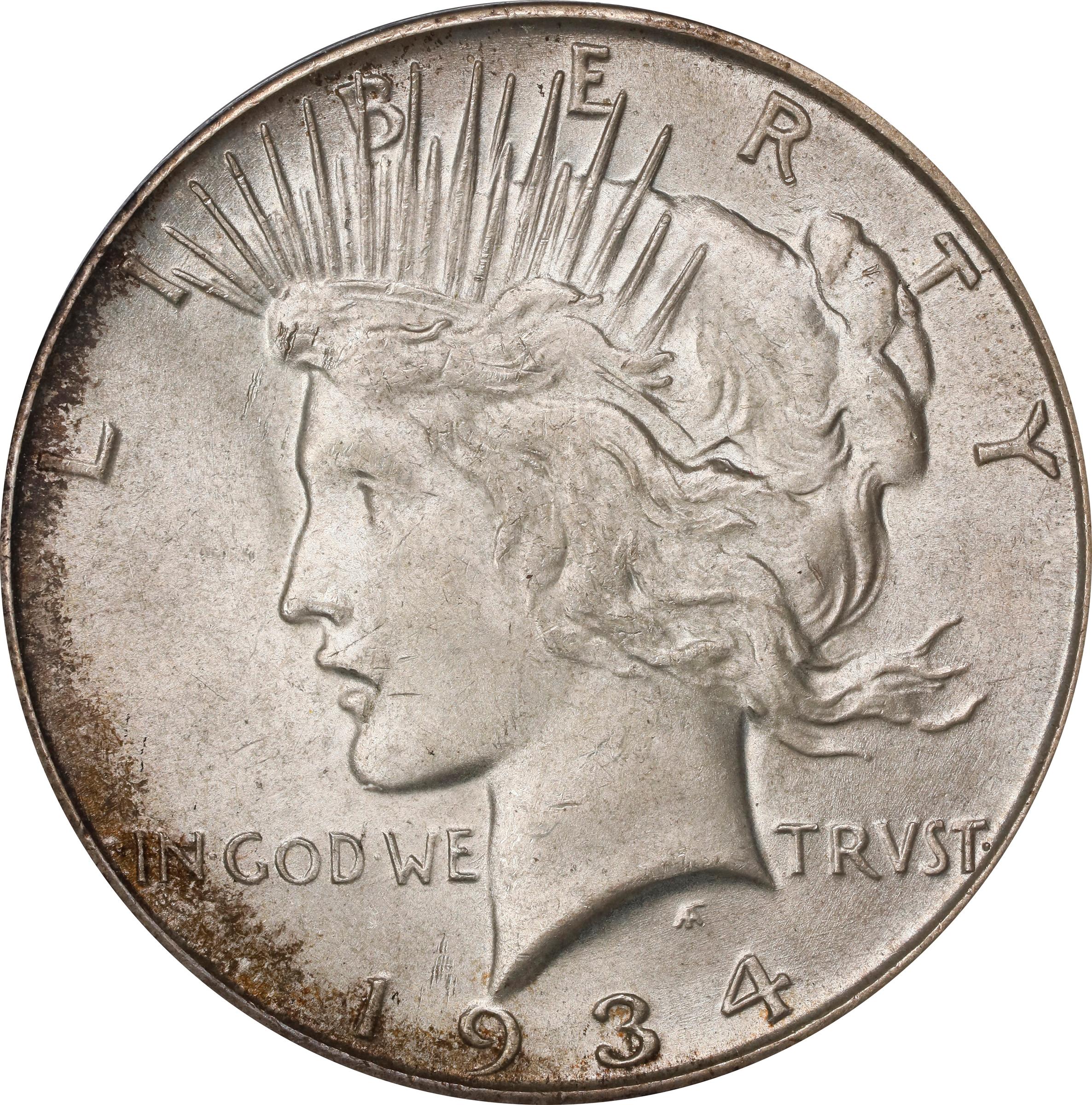 - Original light silver-gray surfaces with enhancing blushes of olive-russet patina here and there at the peripheries, especially at left obverse. The strike is sharp and the luster has a pleasing satin to softly frosted texture. Rarest of the Peace dollars in Mint State, the key date status of the 1934-S is well known in today's market. Although the 1921, 1927, 1927-S, 1928 and 1934 all have lower mintages, the 1934-S (1,011,000 pieces produced) was not saved to the same extent. Much of the mintage was placed into circulation during the 1930s, explaining the ease with which collectors can obtain worn examples. Buying opportunities for attractive Mint State survivors such as this can be elusive, however, confirming the significance of this offering for the advanced Peace dollar enthusiast.