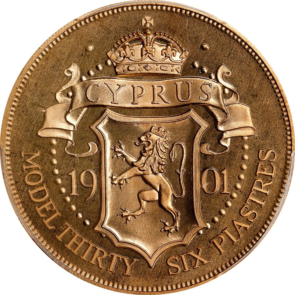- CYPRUS. Bronze Fantasy 36 Piastres, 1901. Victoria. PCGS PROOF-68 Cameo.