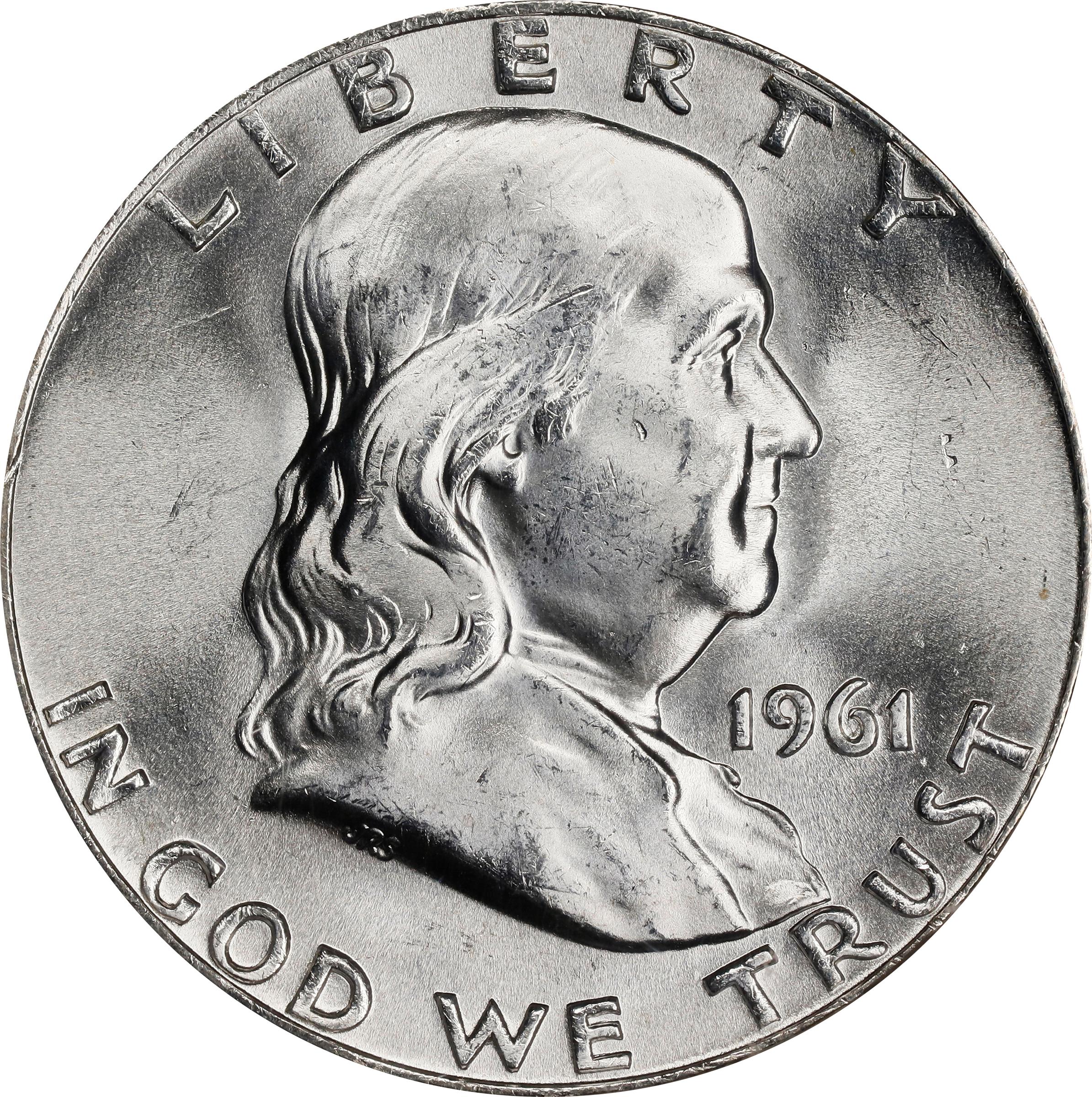 - An engaging piece, with brilliant surfaces and strong satiny mint luster on both sides. There are no marks of note, as befits the assigned grade. The strike is crisp and readily upholds the FBL designation from NGC. Rare at this certified grade level, the 1961-D is a workhorse issue with most examples poorly produced and carelessly handled before entering commerce. A refreshing exception, the offered coin has much that will appeal to advanced Franklin half dollar enthusiasts.