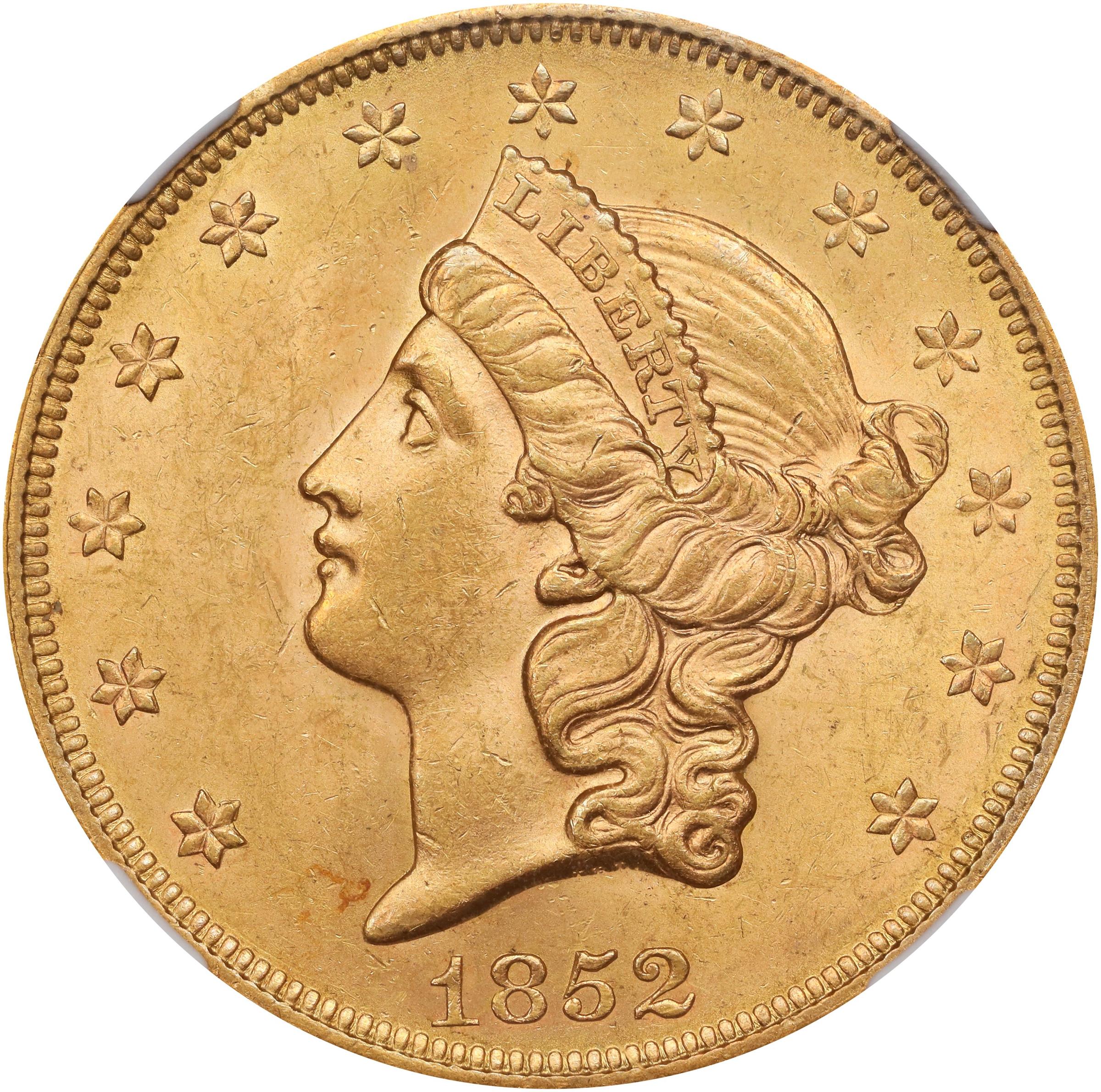 - Lovely warm rose-gold color and pleasing mint luster blanket both sides, the surfaces of which are uncommonly smooth for both the issue and the assigned grade. A sharp to full strike adds to the appeal of this highly desirable example. The mintage for the circulation strike 1852 double eagle is 2,053,026 pieces. As with most early Philadelphia Mint double eagles, the quantity struck reflects the huge influx of gold from the California gold fields that was shipped to the Northeast beginning in 1849, then growing considerably larger with each passing year. The Philadelphia mintages would begin to lessen in size, however, after the opening of the mint at San Francisco in 1854, although not to the same extent as in New Orleans.<p>Most 1852 double eagles remained in the United States and were used in domestic commerce, though many were sent overseas years later, by which time the coins had already acquired considerable wear. Today's research suggests that only 50 to 100 different examples can be accounted for in Mint State, with most of the known survivors at the lower end of the grading scale. Indeed, even a coin in MS-60 represents a significant find in today's market. Not all that far removed from the Select Uncirculated category, this offering represents a significant bidding opportunity for the astute numismatist.