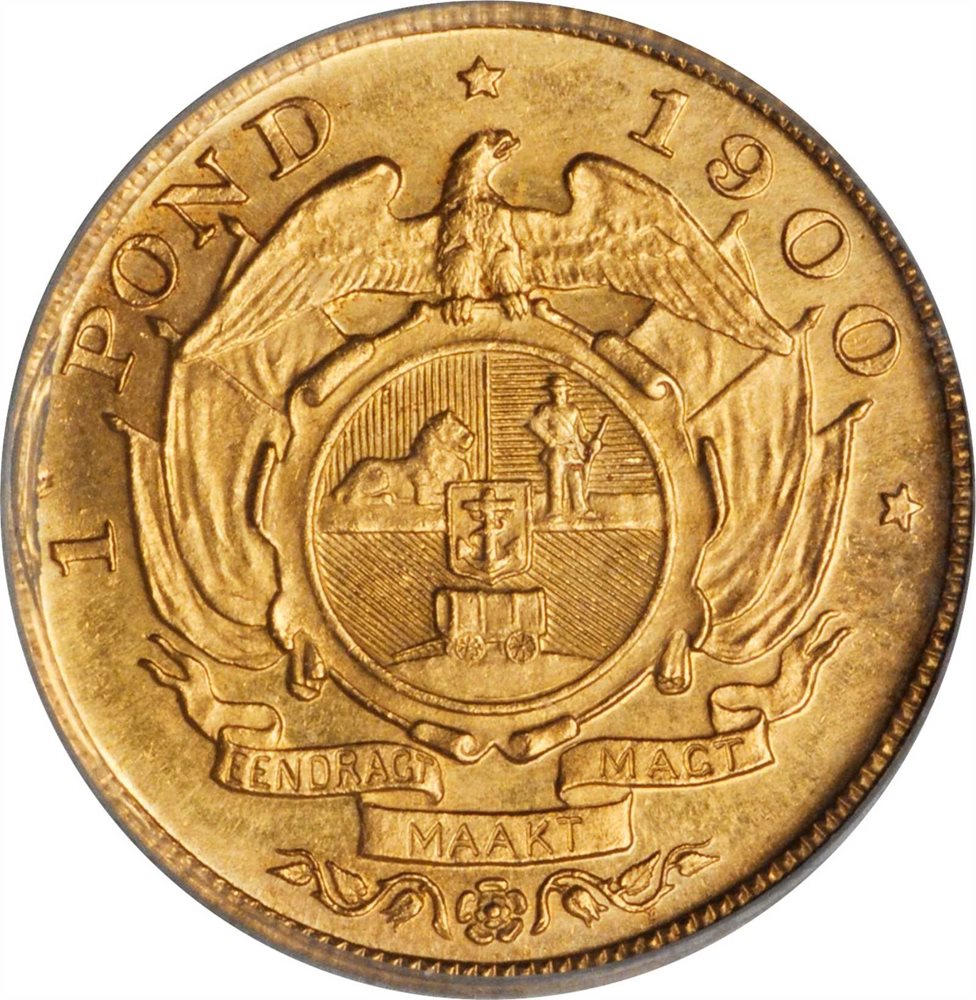 Fr-2; KM-10.2; Hern-Z53. Restrike. Allegedly struck without authorization with dies taken from the mint in Pretoria. Seldom encountered, but considered necessary for the completion of the Pond series. A fabulous example that is arguably better than the assigned grade. Rich lemon yellow gold and without the spotting sometimes seen on other restrikes. A very tough coin at this level, and one sure to see spirited bidding at auction.