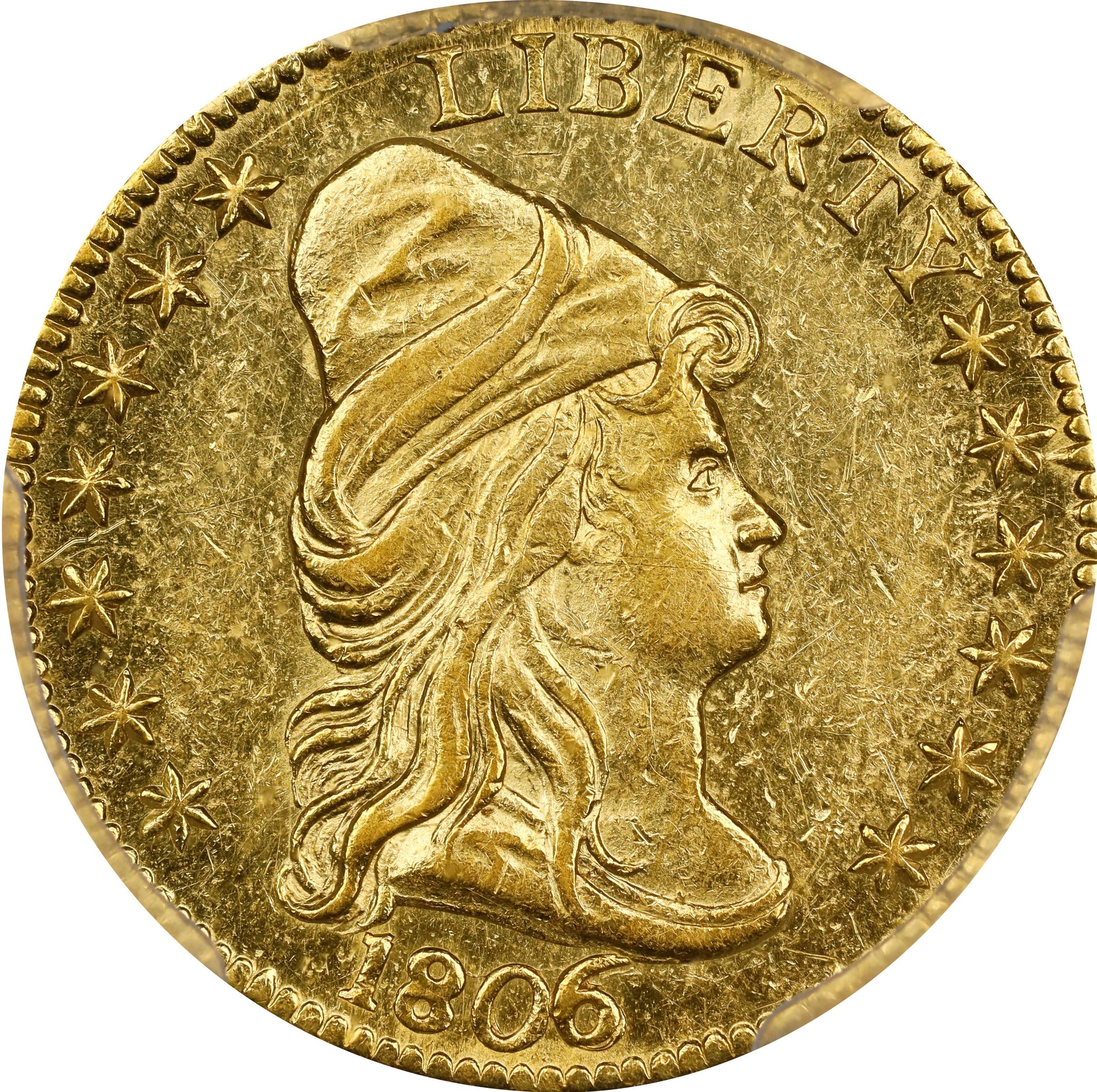 - Offered is one of the very few certified Mint State survivors of a rare die pairing for a rare early quarter eagle issue. This is a bright and attractive coin, displaying green-gold color, intense frosty luster and semi-reflective fields. Striking detail is superior for a product of the early United States Mint, the impression ideally centered on both sides and all design elements boldly to sharply rendered. A few adjustments marks (as made) in the center of the reverse are so light as to be easily overlooked in-hand, and they hardly inhibit the definition on the eagle's breast and the top of the shield. Grade-defining marks and are small and singularly inconspicuous, and the eye appeal is strong for a Capped Bust Right quarter eagle at the lower reaches of Mint State preservation. BD Die State c/b.<p>With an estimated mintage of just 480 pieces, the 1806/5 is not only rarer than its 1806/4 counterpart, but it is also one of the most elusive issues in the Capped Bust Right quarter eagle series. It is one of the few varieties in U.S. coinage history struck from an obverse that was previously used in production of a different issue (1805 quarter eagle), annealed again, overdated, and then used to strike coins of another issue. Just 25 to 35 examples are believed extant in all grades (per John W. Dannreuther, 2006), indicative of the wholesale destruction through melting of pre-1834 U.S. gold coinage. The present example qualifies as Condition Census and has much to offer early gold specialists and advanced type collectors.