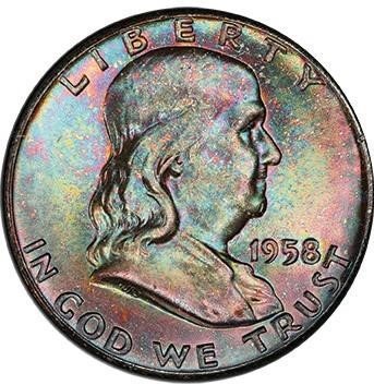 WOW! What an amazing looking SUPERB GEM that ranks right at the TOP OF THE POP for the designation. Technical grade aside, this coin is a MONSTER toned SUPERB GEM that will delight any collector of anything toned! Both sides of this exceptional quality 1958 is awash in a special blend of iridescent pastel tones in every hue seen in the visible spectrum from reds and oranges to blues and violets, with everything in between. The swirling blend shows a great mix of both broad splashes of color as well as dappled flashes of color throughout the reverse. We rate the color as a 9+ on our 10-point color scale. The strike is nearly complete with just some minor weakness of the bell lines at the left of the crack. We know this coin has been submitted trying for an FBL designation--it is that close. PCGS 111, NGC 69, CAC 57. There are just six in MS67+ and NONE FINER! This is not the one that sold in August 2019. We know this stunning coin will bring a WORLD RECORD price when the hammer falls. Our estimate will prove VERY conservative. Cert. Number 38666824.00 PCGS # 6674.00