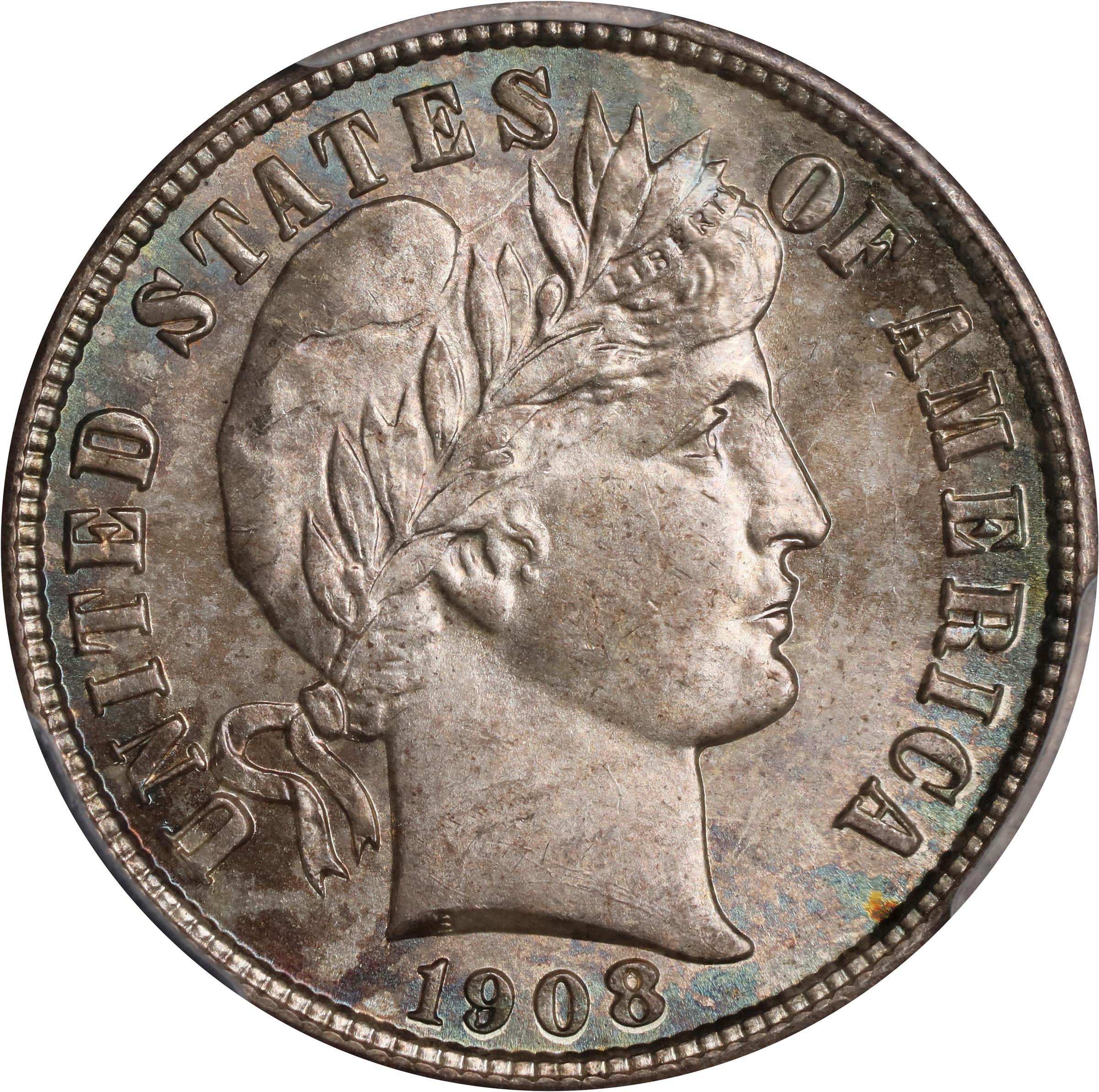 - A lustrous Gem that boasts a very sharp strike, outstanding surfaces, and delicate russet and blue peripheral toning. A median rarity in the Mint State Barber dime series, the 1908-S is scarce in all grades from MS-60 to MS-65. The issue is rare any finer and equally as challenging to locate in the highest Mint State grades as the (much) lower mintage 1915-S, as well as the 1904, 1906-D and 1909-O. This is a particularly noteworthy Condition Census example.