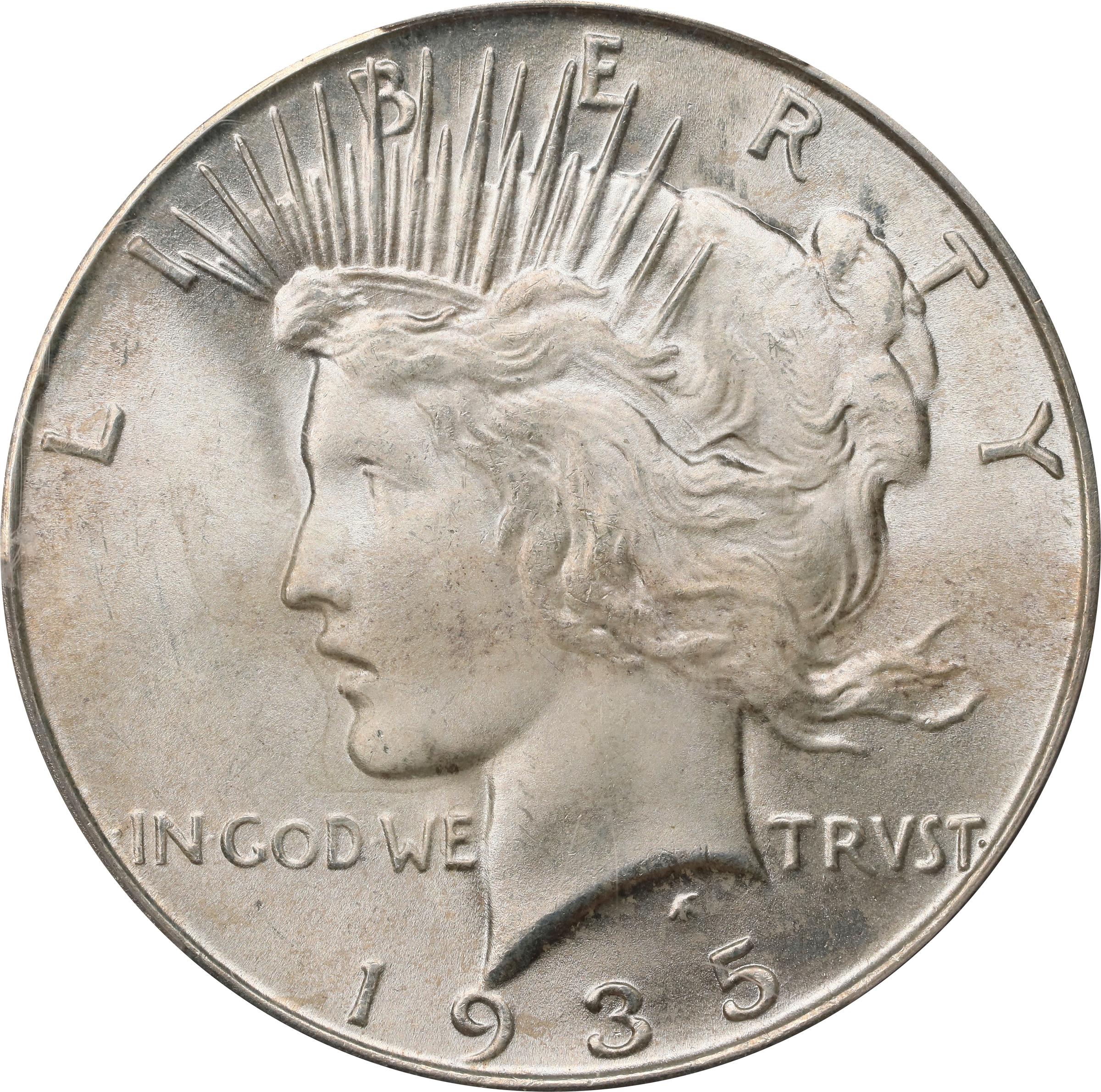 - Lightly toned in mottled sandy-gold iridescence, both sides exhibit full mint luster in a smooth satin texture. Boldly to sharply struck overall. Just under 2 million silver dollars were struck at the San Francisco Mint in 1935, which was the highest mintage of any issue from the 1930s. Most of these coins followed the trend of previous years and were placed in storage, only to be released by regional banks in 1949 and 1950. There was little numismatic interest in this issue at either its debut or later release, and the conditional rarity of the 1935-S was underappreciated until more recent times. While it is readily available in lower Mint State grades up through Choice, in Gem and above it is remarkably scarce. For collectors assembling an advanced set of Peace dollars this is certainly an important offering.