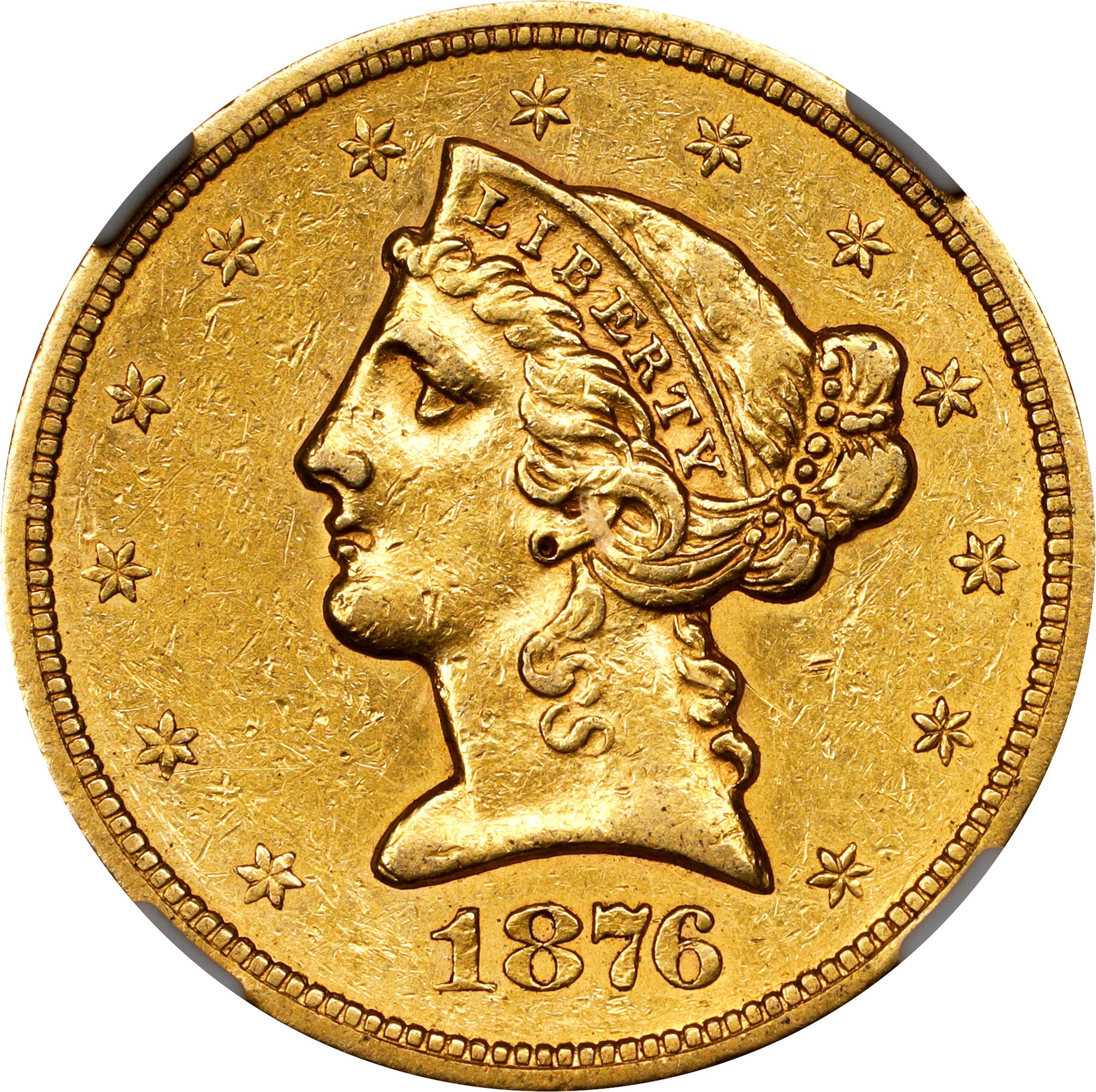 - This handsome 1876-S half eagle is boldly defined and features vivid honey-orange color with tinges of pinkish-rose iridescence. Plenty of satiny mint luster remains, and the surfaces are nicely composed for having seen actual, however light commercial use.<p>The 1876-S is one in a line up of elusive San Francisco Mint fives from this decade. Just 4,000 coins were struck, the vast majority of which have long since been lost to circulation. Survivors are few and far between, and most are well worn, if not also impaired. Even the National Numismatic Collection in the Smithsonian Institution can only muster a VG-10 for this issue. Until the last decade or so, the Garrett specimen in PCGS (formerly NGC) MS-65 was the only Uncirculated 1876-S half eagle known. The current <em>PCGS Population Report</em> lists an MS-60 along with the newcomer to the market graded MS-61 from our Spring 2022 Auction sale of the Fairmont Collection's Hendricks Set. The <em>NGC Census</em> reports a single grading event for the issue in Mint State, at MS-62. Certified Choice AU examples are nearly as rare, and this AU-55 example will certainly see spirited bidding from advanced gold enthusiasts.