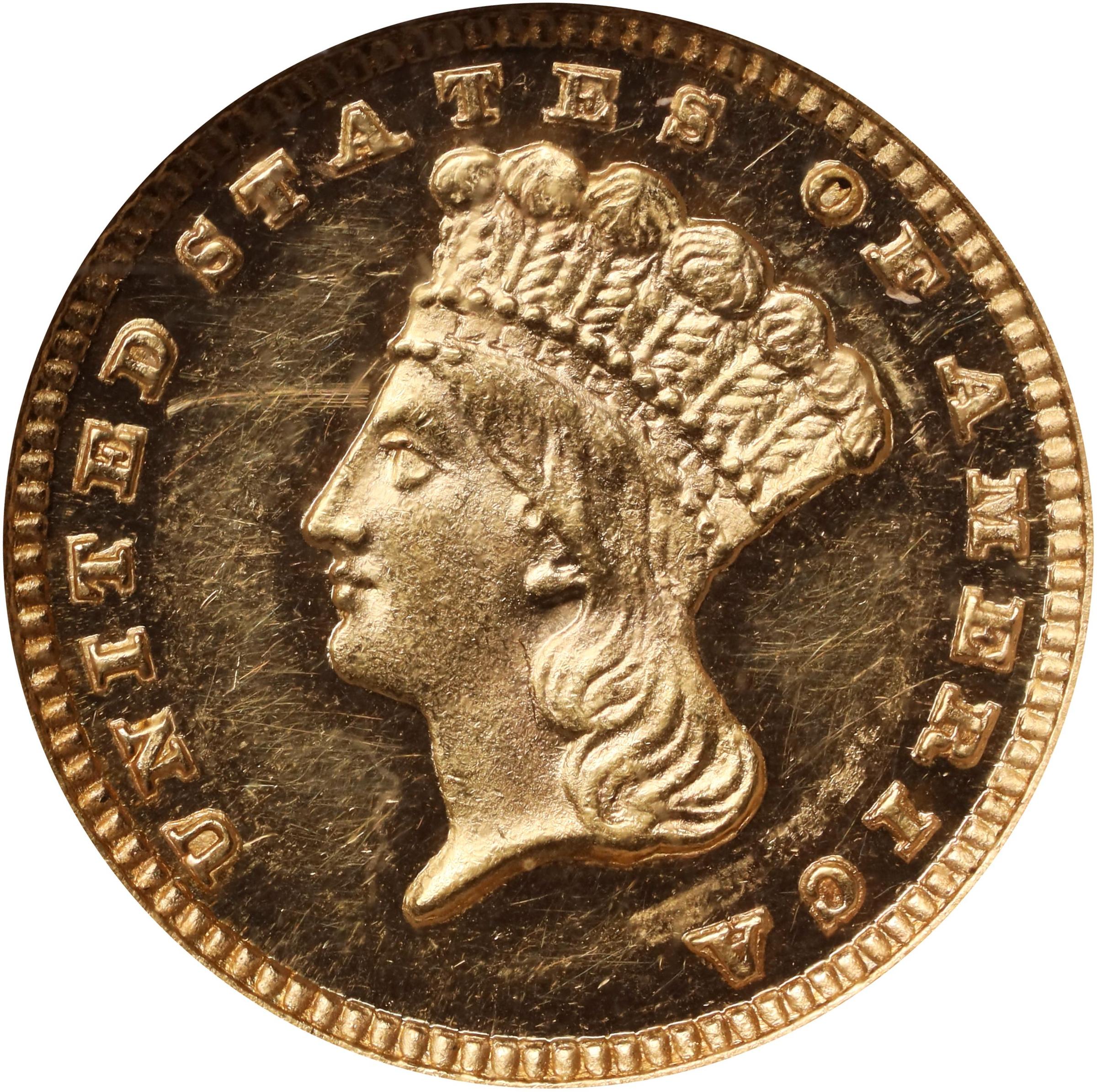 - A lightly handled example, both sides exhibit bold cameo contrast between frosty, fully impressed devices and nicely reflective fields. Medium gold color, with a number of small marks and hairlines present in the fragile fields. The Proof mintage of 87 pieces for the 1881 gold dollar is perhaps represented by 40 to 50 individual coins today, with some duplication likely within the modest numbers reported in the <em>PCGS Population Report</em> and <em>NGC Census</em>. Among those few that offer the deepest and greatest cameo contrast, as here, are some of the first pieces struck by the Proof dies. As more coins are struck, the degree of contrast and depth of frost on the devices tends to balance out, explaining the paucity of grading events in the Deep/Ultra Cameo category.<p>The number of Proof gold coins produced in 1881 took a modest jump from the typical 20 to 40 pieces struck in the previous decade, as the Mint once again offered this coin both as singles and in sets. Additional orders would be received from contemporary numismatists later in the 1880s, and by the time the gold dollar series ended in 1889 yearly Proof mintages had climbed into the 1,000+ coin range. The increased demand for these Proofs did not, however, result in the expected higher survival numbers based on the number of coins known today.
