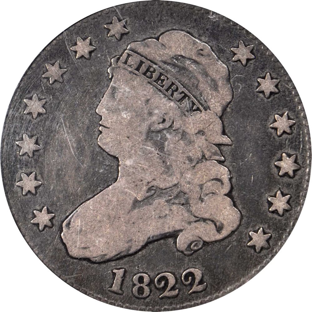 The Philadelphia Mint used one obverse and two reverse dies in two marriages to strike approximately 64,080 quarters bearing the 1822 date. Of the two varieties Browning-2, offered here, is by far the scarcer and more popular in numismatic circles. The reverse of this variety is a blundered denomination with a 25 punched over a still readily evident 50. The poor execution of this correction might explain this variety's rarity, i.e. few examples were struck before the die was retired. On the other hand, the Mint did resurrect this blundered reverse for the 1828 B-3 quarter, also a scarce variety, yet not quite as rare as its 1822 B-2 counterpart.