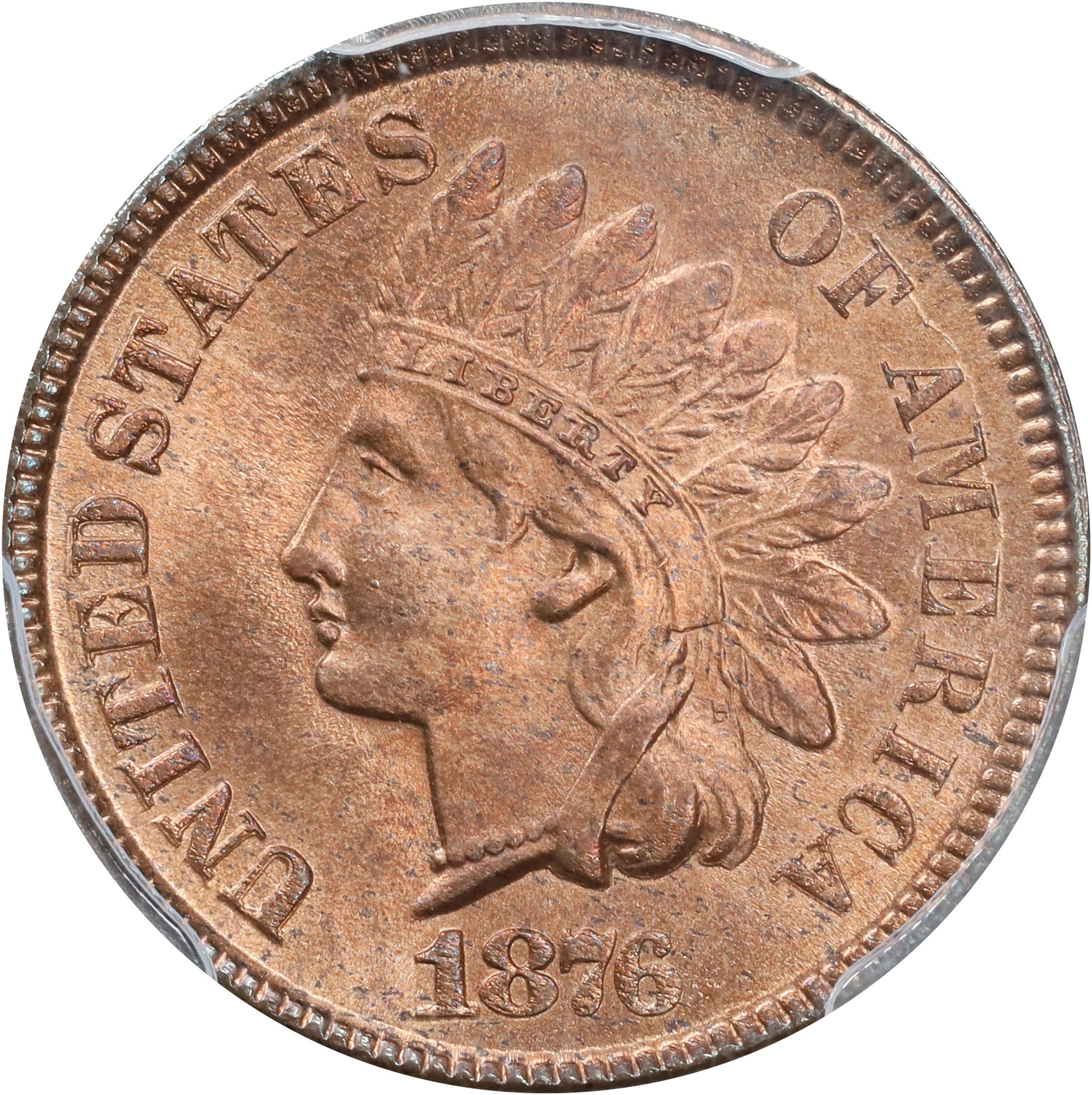 - Deep, rich rose-red color flows over smooth, satiny surfaces on both sides of this bold and inviting upper end Gem. The Mint redeemed 5,932,723 bronze cents in 1876, reissuing 5,599,500 examples to meet much of the commercial demand that year. As a result, only 7,944,000 new coins were produced from 1876-dated dies, this being one of the lower mintage circulation strike issues of its era. A Condition Census survivor, the present example is an undeniable highlight of the extensive Indian cent offerings in this sale, and it would serve as a focal point in many specialized sets.
