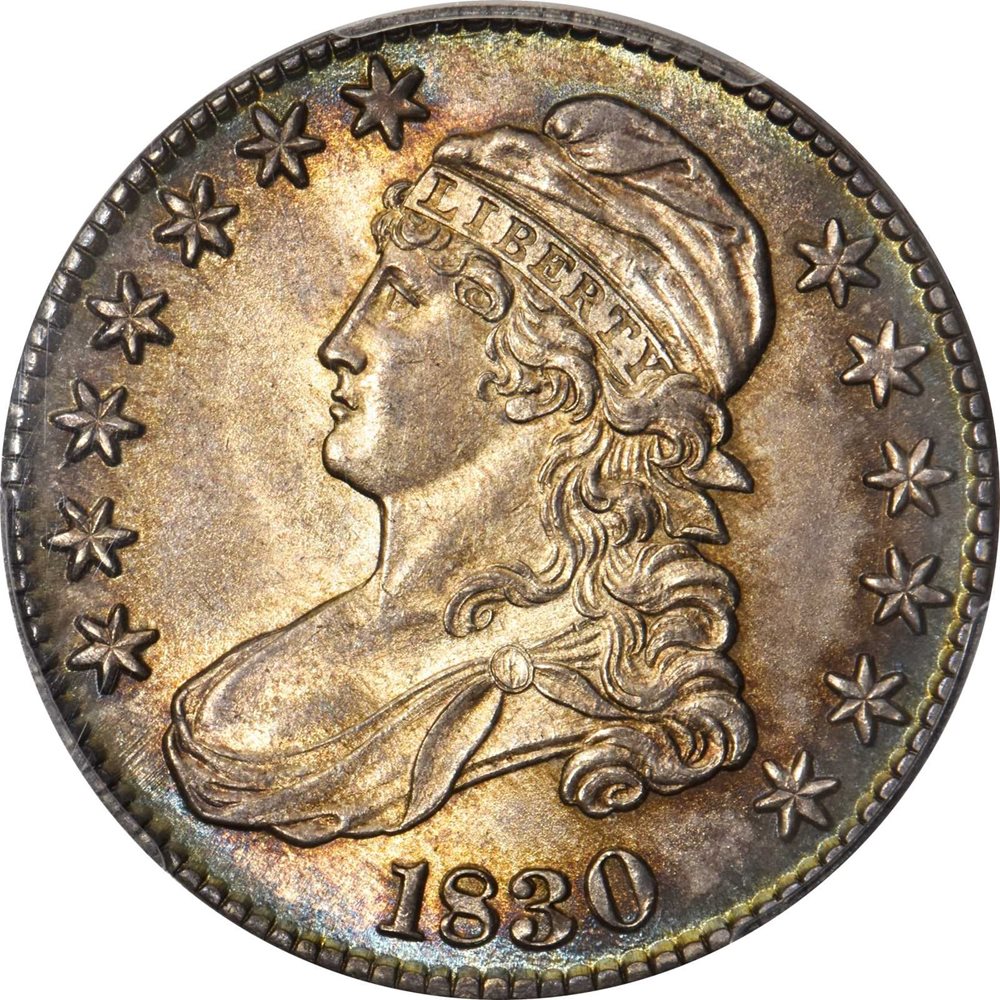 This delightful Gem 1830 half dollar will be equally well suited for inclusion in a high grade type or variety set. Thin ribbons of iridescent cobalt blue peripheral toning frame centers that alternate between champagne-apricot and silvery near-brilliance. The strike is expertly centered and universally sharp on both sides, most design elements exhibiting full detail. The surfaces are satiny and smooth, very nice for the assigned grade. This beautiful coin is certain to appeal to discerning numismatists. Listed in the Spring 2020 revision to Stephen J. Herrman's Auction & Mail Bid Prices Realized for Bust Half Dollars: 1794-1839, where it is tied for CC#4 at the MS-65 grade level.