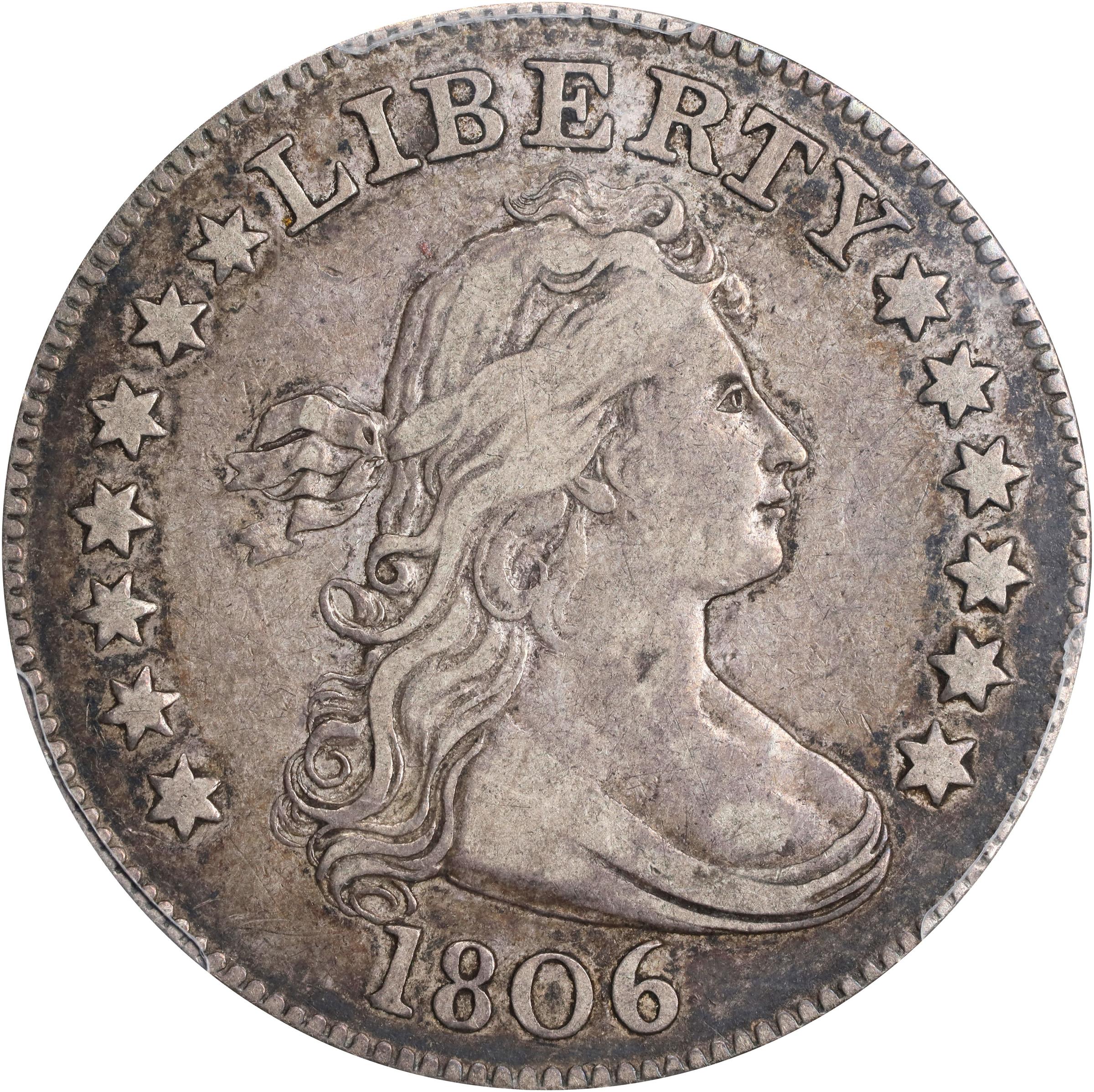 - Tompkins Die Stage 1/2, Rea et al. Die State b. <strong>Tompkins Plate Coin</strong>. Richly original surfaces exhibit glints of peripheral steel and russet on otherwise pewter gray patina. This is about as nice as they come for a Draped Bust quarter in Choice VF, the typical striking softness evident at central and upper reverse, but the balance of both sides boldly defined and the surfaces absolutely free of troublesome marks.<p>Struck after both remarriages of the reverse die in the 1806 B-5 pairing, this coin exhibits a retained cud at the border outside the letters ST in STATES. In the terminal state of this die, before its final retirement, this break would shift up and become a full cud (see below, next lot). The obverse is a workhorse die that is also seen in the 1806 B-7, B-8 and B-10 pairings.<p><strong>Steve M. Tompkins Commentary:</strong> Another ex Reiver coin that I knew I would have little chance of upgrading. As predicted, even after almost 20 years I never did. That's ok, as it is a nice mid grade example that no one should be ashamed to own.