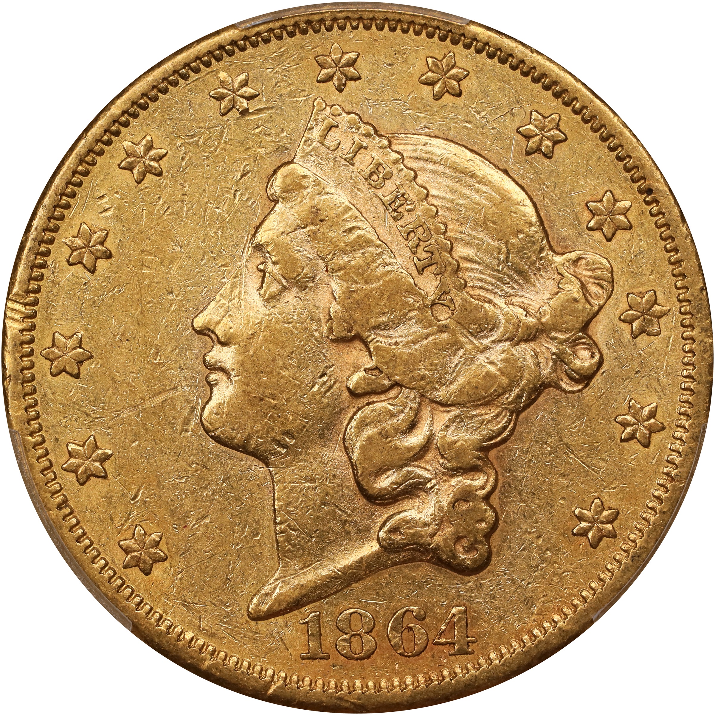 - Bold detail and warm olive-apricot color provide strong eye appeal for this scarcer date Type I Liberty Head $20. Federal records report that 204,235 circulation strike double eagles were coined at the Philadelphia Mint during 1864, and due to the continued problem with hoarding -- which lasted until late December 1879 -- none were used in regular day-to-day transactions in the eastern half of the United States. It seems that many were exported, and to the extent that this happened, most were likely melted into bullion, as examples have not turned up in European bank hoards to any great extent. We estimate a surviving population of between 300 to 450 pieces, most of which grade VF or EF. This Choice Extremely Fine example has much to offer the discerning double eagle enthusiast.