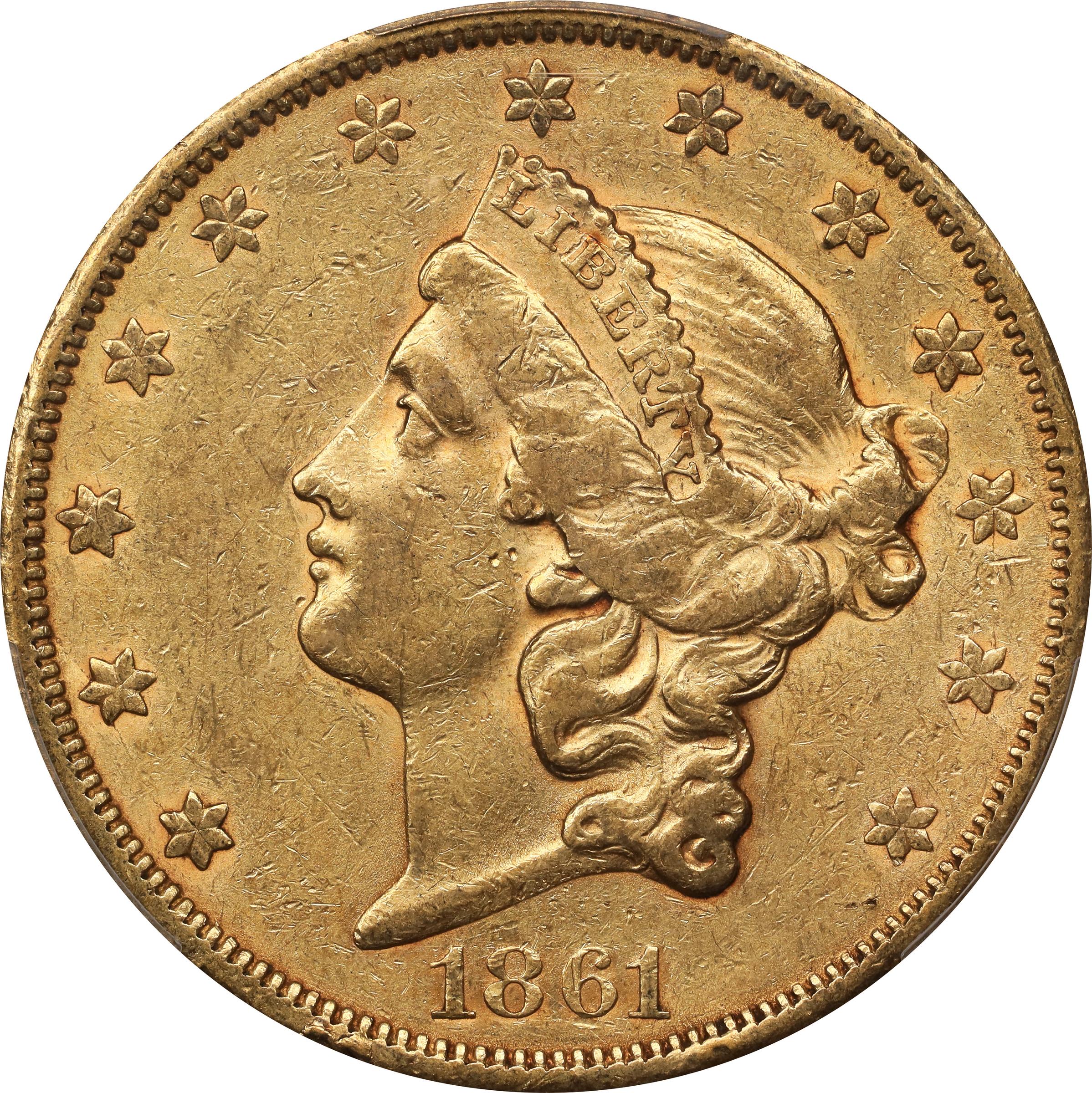 - After producing 19,250 double eagles in early 1861 using the famed Paquet Reverse, the San Francisco Mint went on to strike an additional 768,000 examples using the pre-existing "regular" Longacre reverse. The vast majority of these coins entered circulation in the West and were eagerly accepted, and most survivors available for today's collectors tend to be in heavily worn condition. Just a trace of friction is noted on either side of this Choice AU piece. Satiny frost clings to the surfaces and highlights honey-apricot color. Nicely detailed and displaying a minimal amount of contact marks, this is a high end example for the grade. A very popular Civil War year date as well adds another layer of desirability.