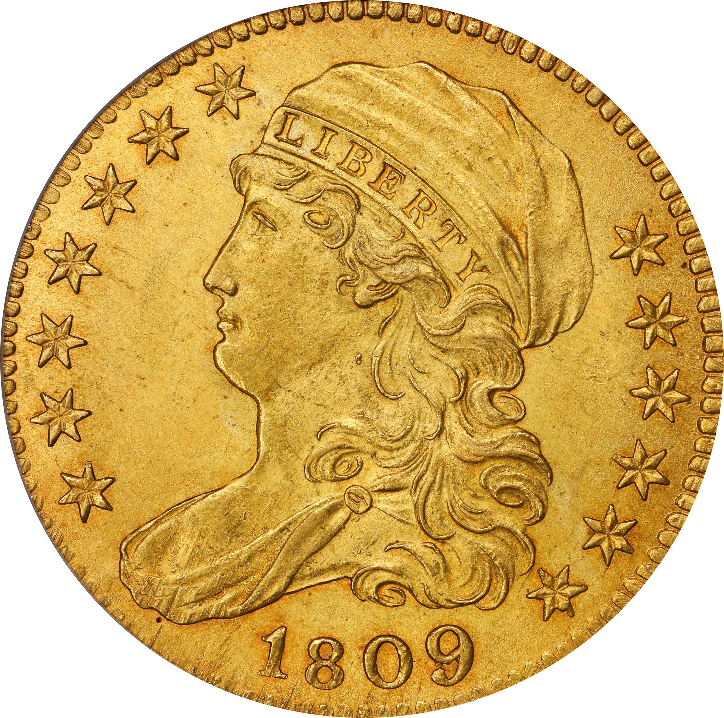 - A simply outstanding near-Gem example of the type and issue, this is one of the finest Capped Bust Left half eagles that your cataloger has handled in a professional numismatic career spanning 25 years. Thick, lovely mint luster remains as full and intense as the day of striking. The surfaces have a soft satin texture and also sport wonderfully original color with wisps of pinkish-rose iridescence on dominant deep honey-gold. Virtually all features are fully rendered from an expert strike, only the end of Liberty's bust and the first letter S in STATES a tad soft with a couple of faint adjustment marks (as made) in the former area. Surfaces are remarkably smooth, well composed, and very close to full Gem Mint State. BD Die State b/b.<p>There is only one die marriage known for the 1809-dated half eagle issue; the overdate status is questionable as the fragment within the lower loop of the digit 9 does not precisely match the expected shape of an 8. Nor does this variety appear to be an 1809/9 repunched date, although a misplaced 9 does seem to be the more likely candidate. The estimated mintage of this issue is 20,000 to 33,875 pieces (per John W. Dannreuther, 2006), and survivors number no more than 350 coins in all grades. The Chicago Collection specimen is virtually unimproveable and worthy of the strongest bids.