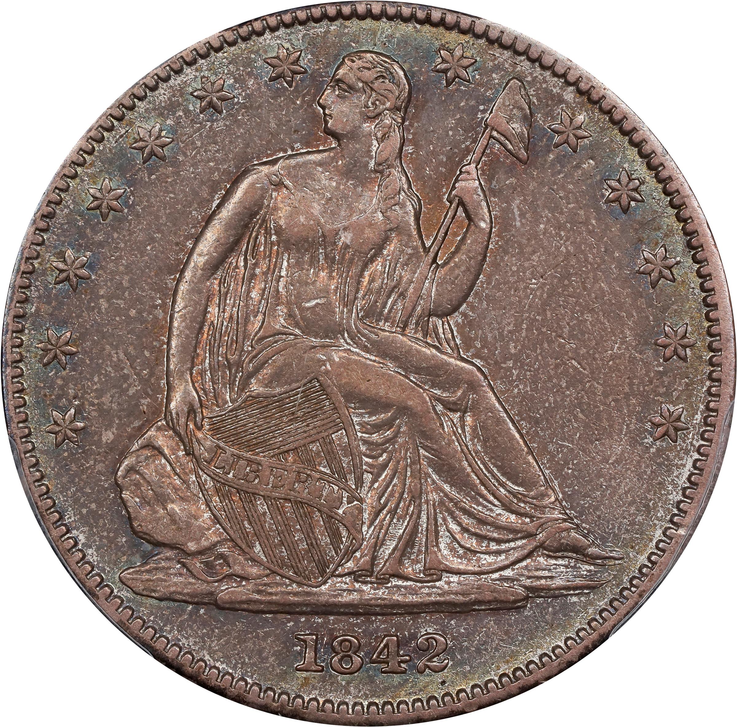 - Bathed in warm mauve-gray patina, this handsome piece reveals flashier, more vivid undertones of pinkish-rose, cobalt blue and antique gold as the surfaces dip into a light. Remaining detail is universally sharp at the assigned grade level, and traces of frosty mint luster remain to further confirm only a short stint in active circulation. The 1842-O Small Date, Small Letters is ranked among the most desirable New Orleans Mint issues in the Liberty Seated half dollar series. It is a significant transitional variety that is scarce to rare in all grades.